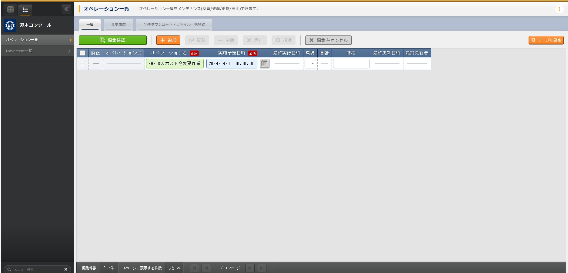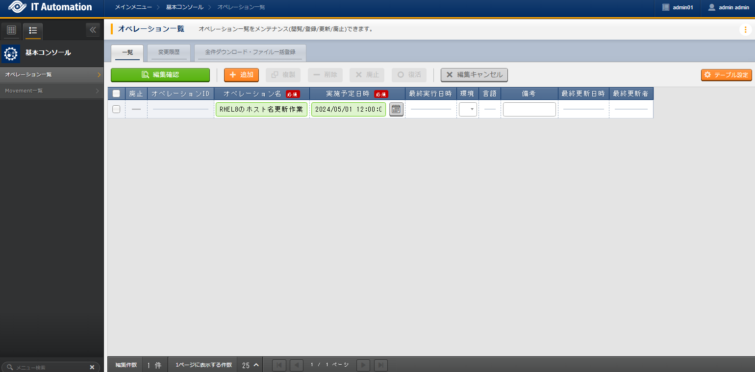 In , select the Host Name Setting Movement, and click Working execution to run the task.Next, in , select the RHEL8 Hostname Update Task operation, then click Decision to select.Finally, review the execution detail, then click Working execution.Open the , after the execution is complete, confirm that the status has changed to “Completed.”
