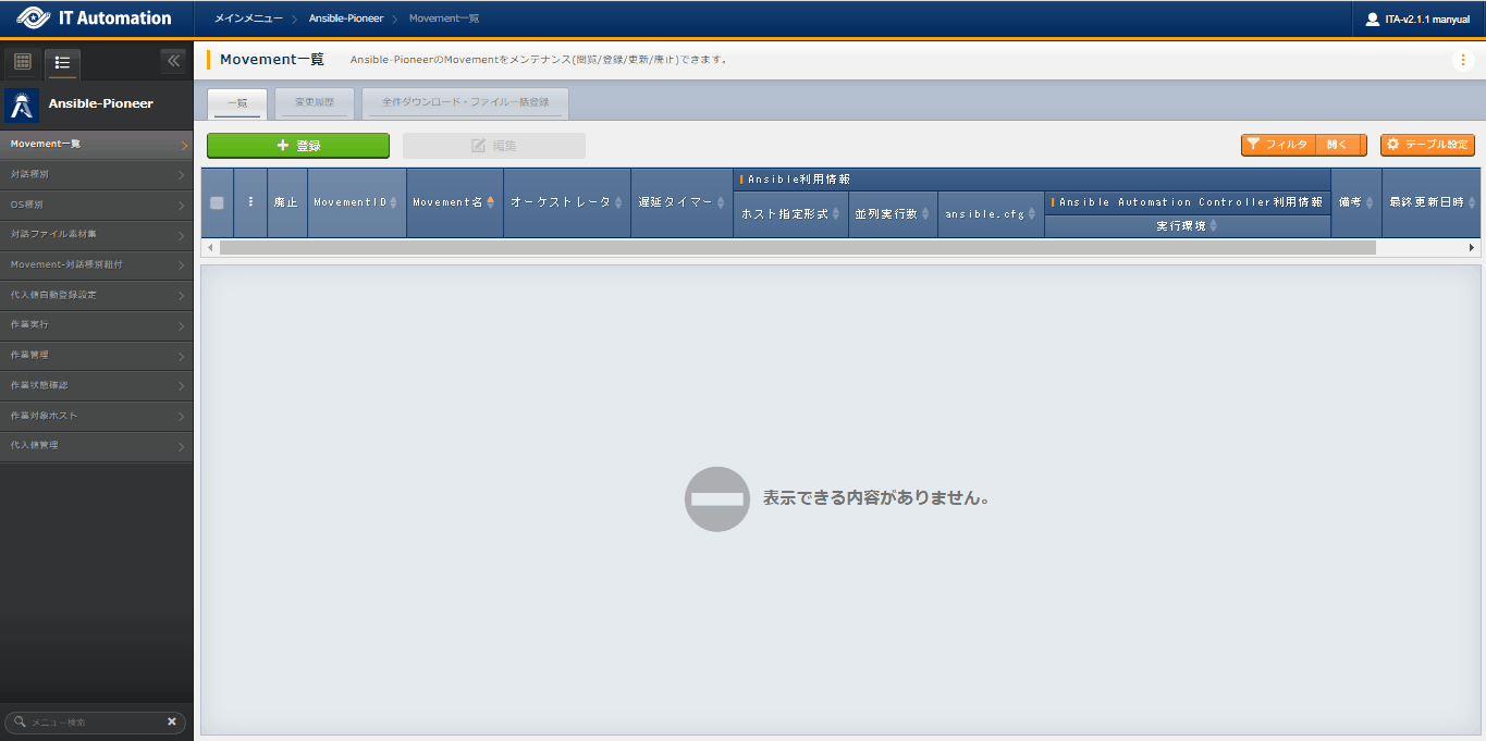 対話種別に紐づけるOS種別とITAシステム独自フォーマットの作業手順ファイル(以降、対話ファイルと称す。)を管理します。 |