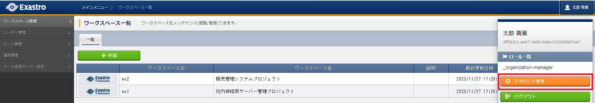 Exastro IT Automation利用中は、メニュー - アカウント管理 は表示されません