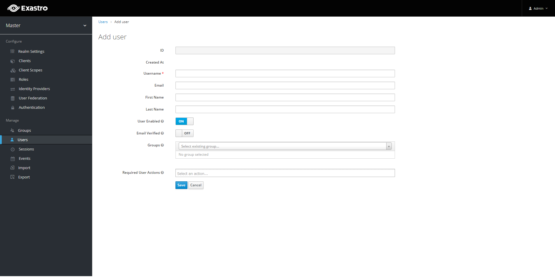 Usernameログイン時に使用するユーザー名を入力しますEmail追加するユーザーのE-mailアドレスを入力しますFirst Name追加するユーザーの名を入力しますLast Name追加するユーザーの姓を入力しますUser Enabled追加するユーザーの使用できる状態を有効・無効で選択しますEmail VerifiedOFFを選択します※ONを選択してもメール送信用サーバー設定が設定されていないと動作しませんGroupsExastro システムでは未対応のため、指定しないでくださいRequired User Actions次回ログインした際に、どのような情報を設定するか設定できます詳しい設定値は、Keycloakの公式ドキュメント をご参照ください - システム管理者のユーザー登録必要な情報を入力後、 Save ボタンを押下して、ユーザーを登録することができます。