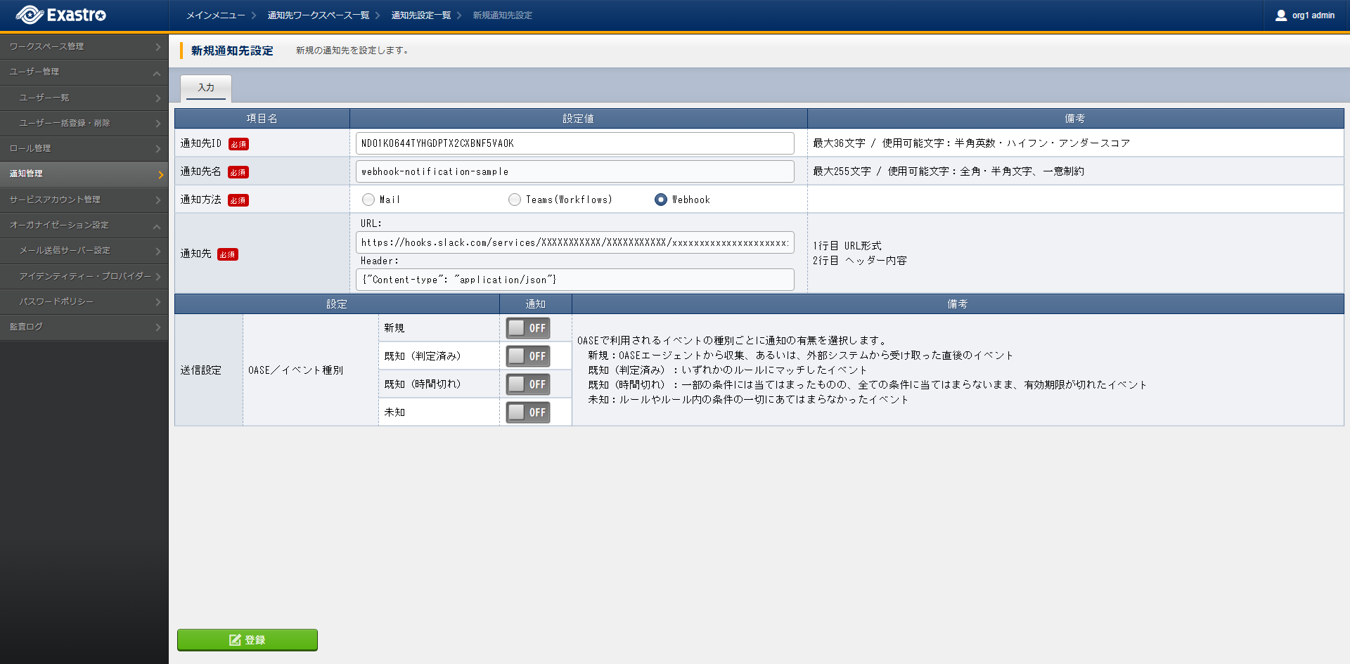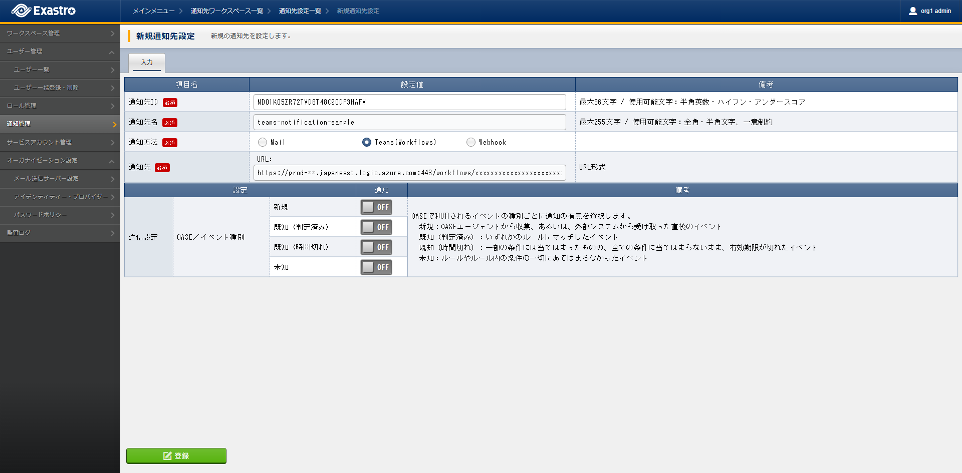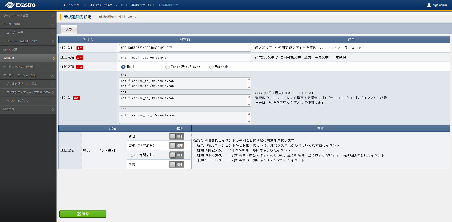 - 画面が表示されるので、通知先の情報を入力し、 登録 をクリックします。