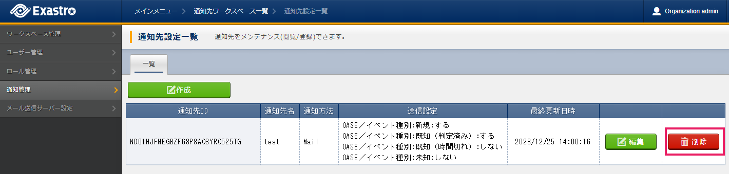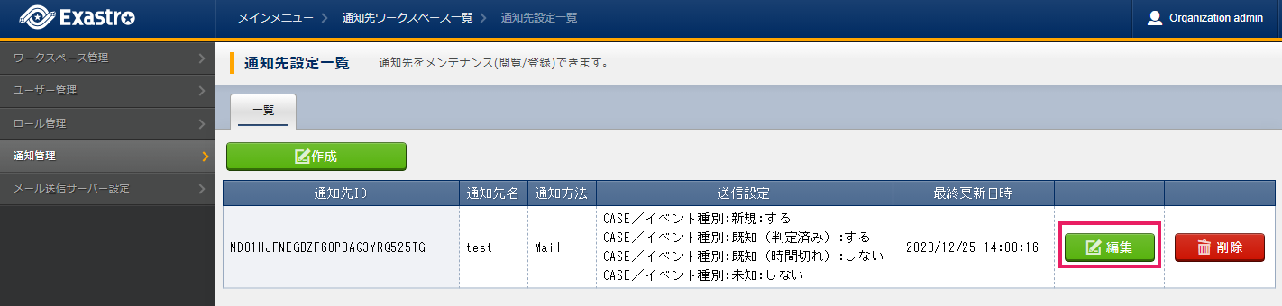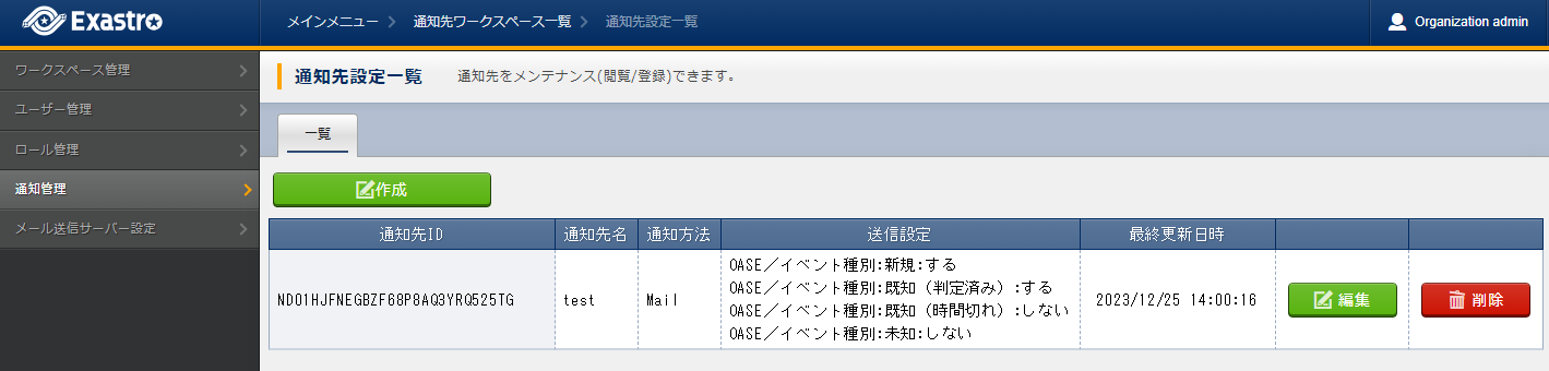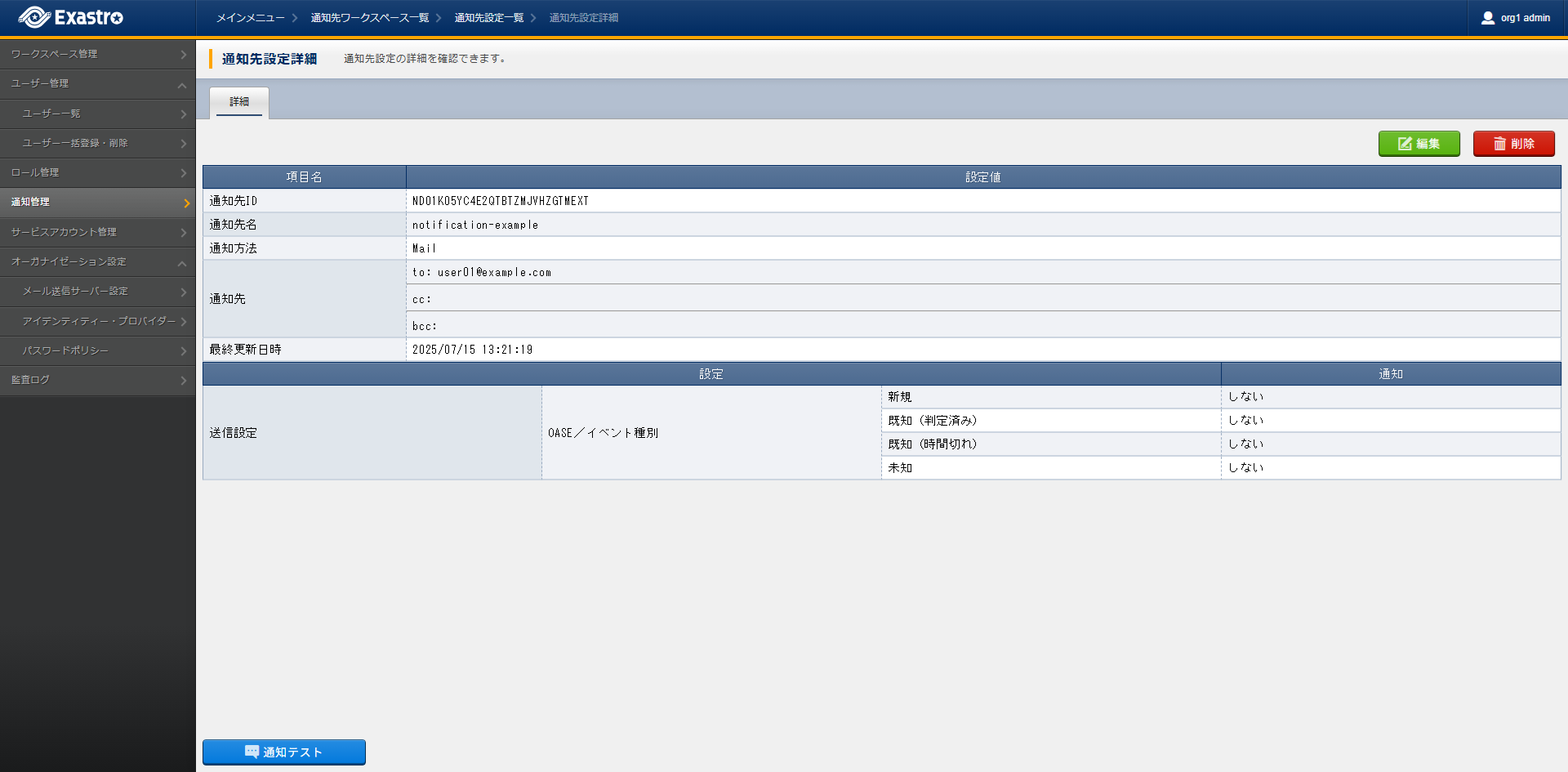 - 画面が表示されます。詳細確認の他、編集、削除、通知テストが実施できます。