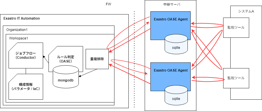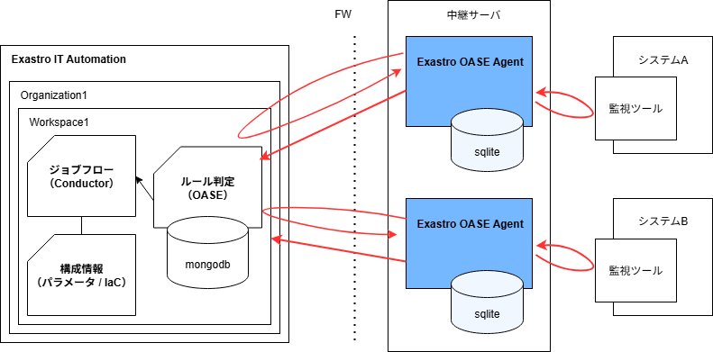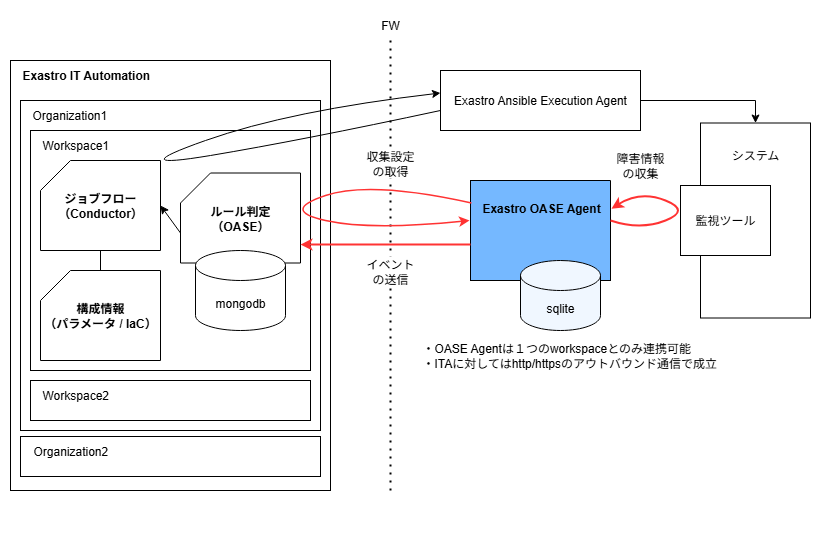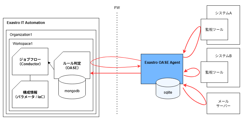 OASE Agentから収集対象サーバ および Exastro IT Automation に対してアウトバウンド通信できる必要があります。