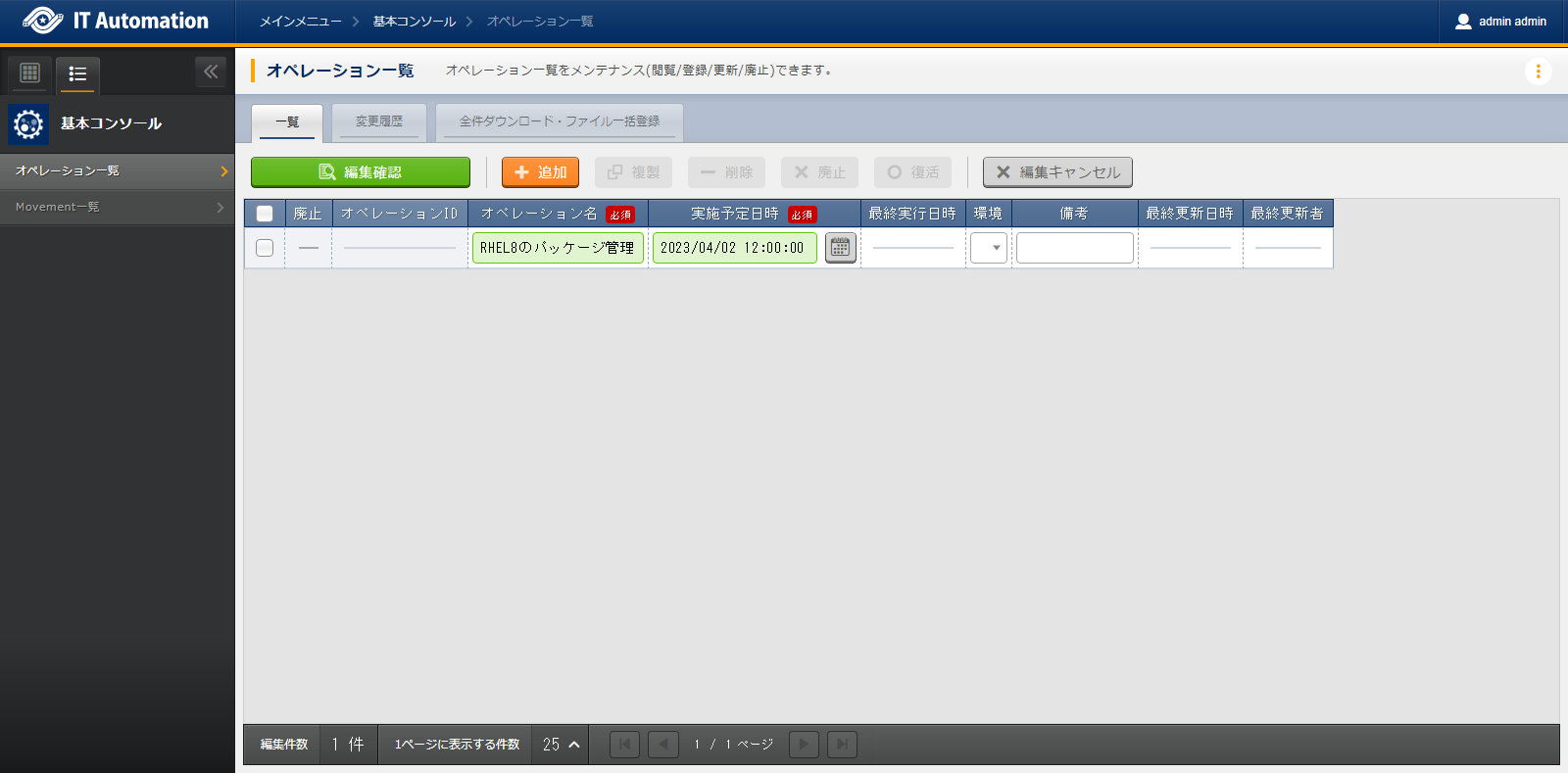 から、パッケージ管理 Movement を選択し、 作業実行 を押下します。次に、 で、オペレーションに RHEL8のパッケージ管理 を選択し、作業実行 を押下します。画面が開き、実行が完了した後に、ステータスが「完了」になったことを確認します。