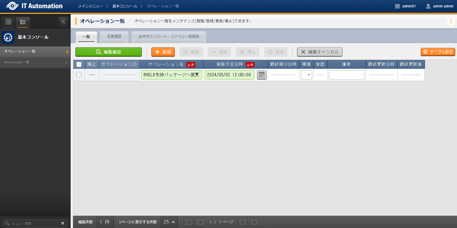 から、パッケージ管理 Movement を選択し、 作業実行 を押下します。次に、 で、オペレーションに RHEL8をDBパッケージへ変更 を選択し、作業実行 を押下します。画面が開き、実行が完了した後に、ステータスが「完了」になったことを確認します。
