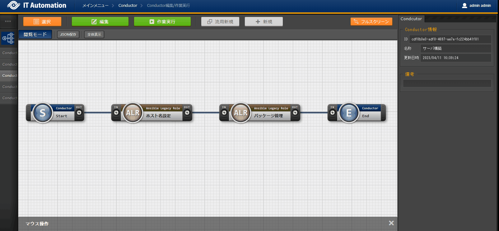から、 選択 を押下します。サーバー構築 Conductor を選択し、選択決定 を押下します。次に、画面上部の 作業実行 で、オペレーションに Webサーバーへの再構築 を選択し、作業実行 を押下します。画面が開き、実行が完了した後に、全ての Movement のステータスが「Done」になったことを確認します。
