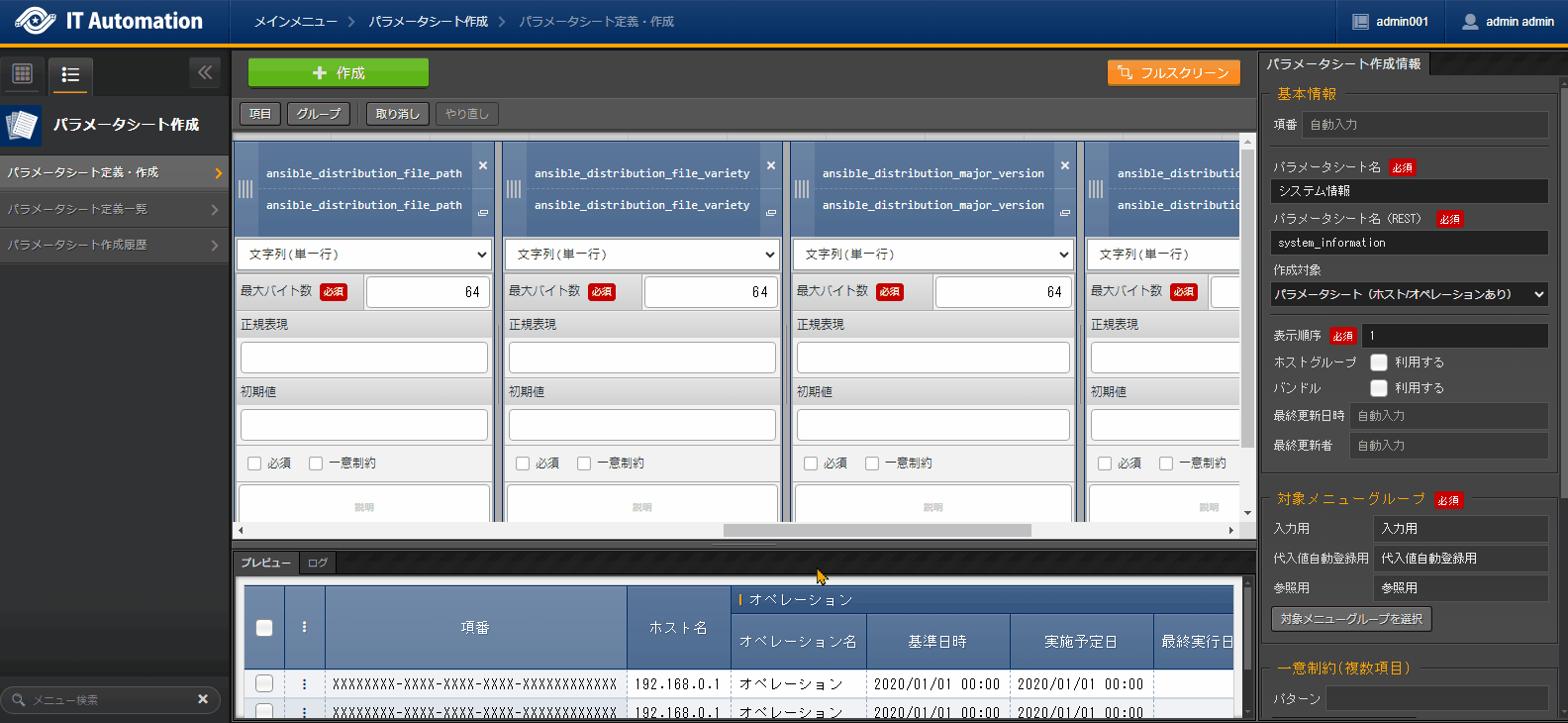 から、パラメータの入力情報を確認しましょう。パラメータシート作成・定義で作成した、システム情報のパラメータが問題なく入力されているか確認しましょう。また、この後の比較作業で実施日時を入力する必要があるので、 から、実施した日付を確認しておきましょう。