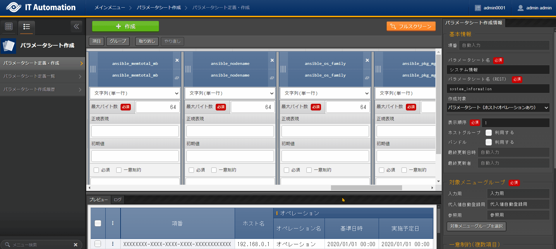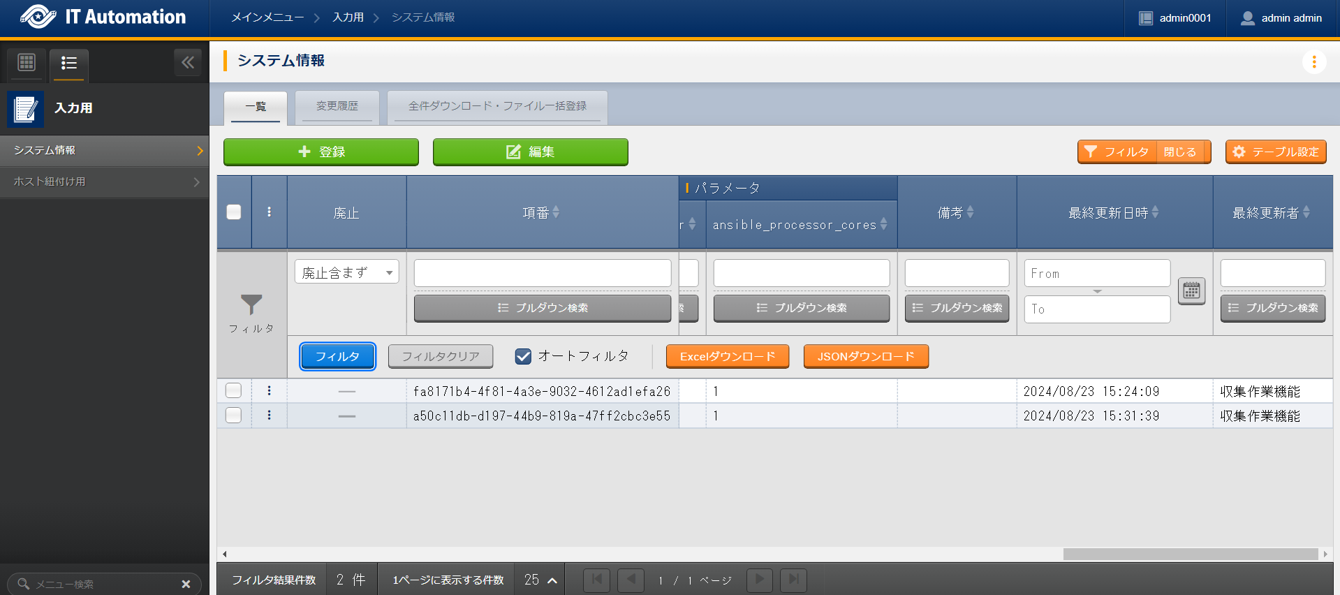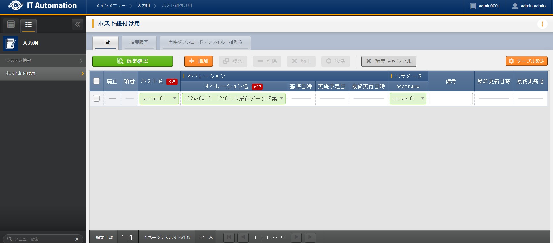 から、パラメータの入力情報を確認しましょう。パラメータシート作成・定義で作成した、システム情報のパラメータが問題なく入力されているか確認しましょう。問題なくシステム情報が収集出来ていれば、ホスト名変更前と変更後の2つのパラメータが入力されています。また、この後の比較作業で実施日時を入力する必要があるので、 から、実施した日付を確認しておきましょう。