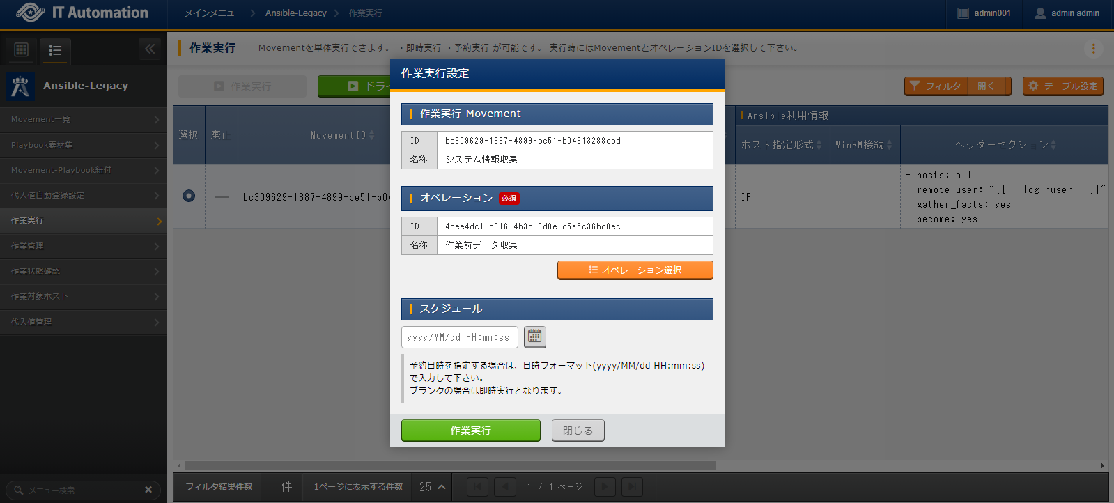 から、システム情報収集 Movement を選択し、 作業実行 を押下します。次に、 で、オペレーションに 作業前データ収集 を選択し、作業実行 を押下します。画面が開き、実行が完了した後に、ステータスが「完了」になったことを確認します。
