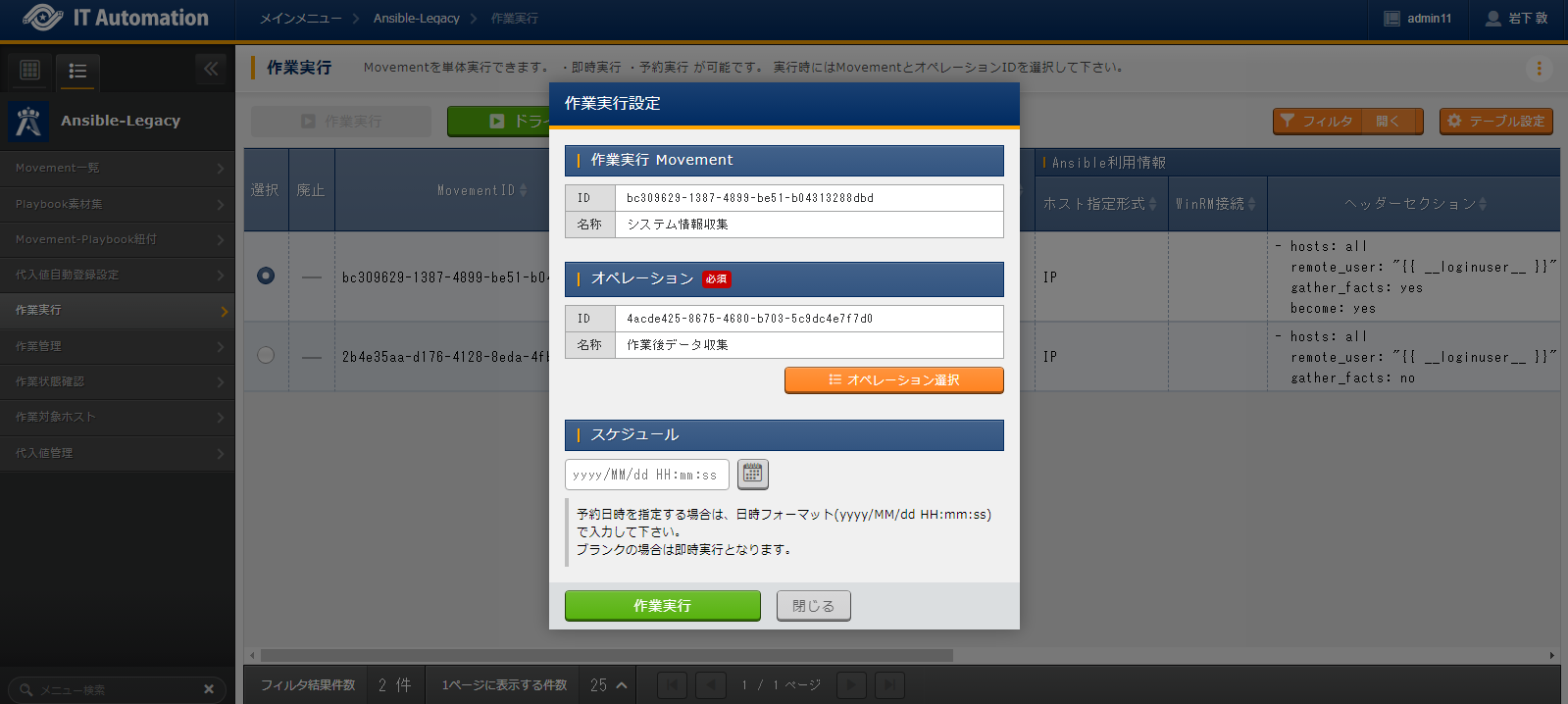から、システム情報収集 Movement を選択し、 作業実行 を押下します。次に、 で、オペレーションに 作業後データ収集 を選択し、作業実行 を押下します。画面が開き、実行が完了した後に、ステータスが「完了」になったことを確認します。