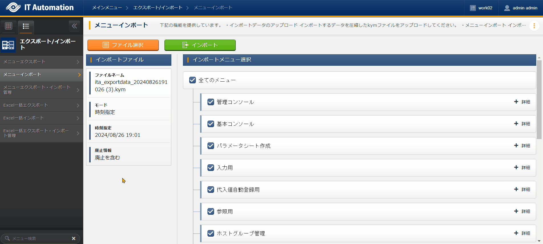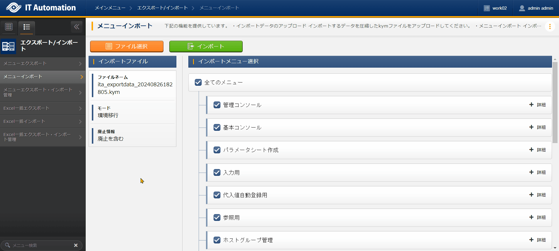 メニューインポート(環境以降)の実行¶