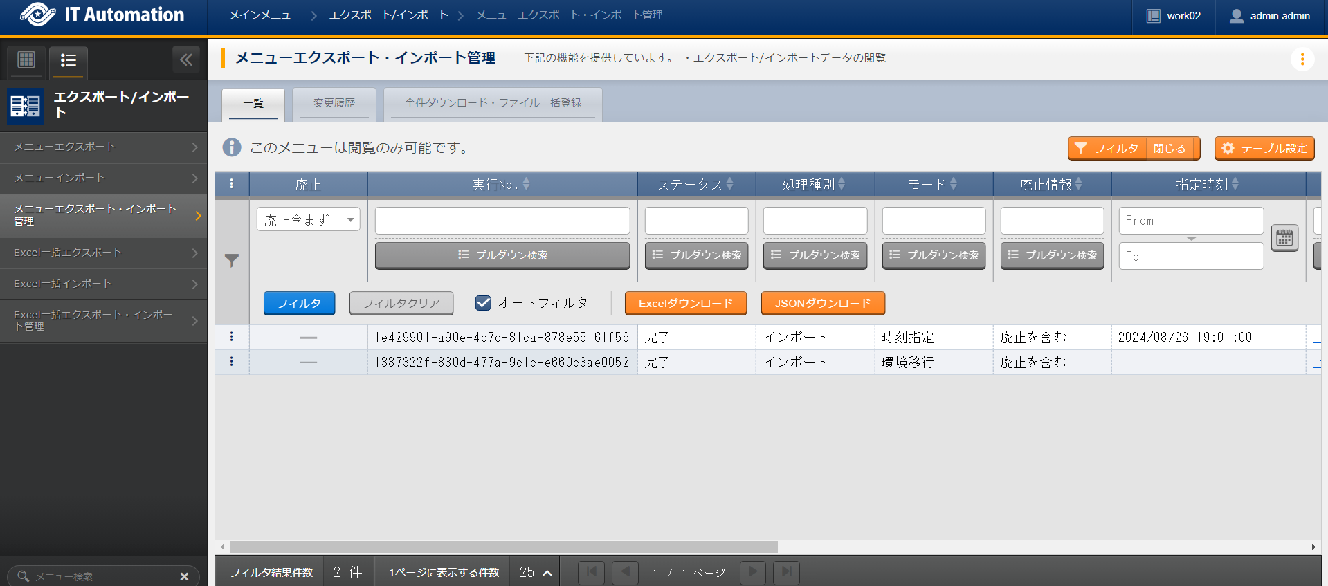 メニューエクスポート(環境以降)の実行¶