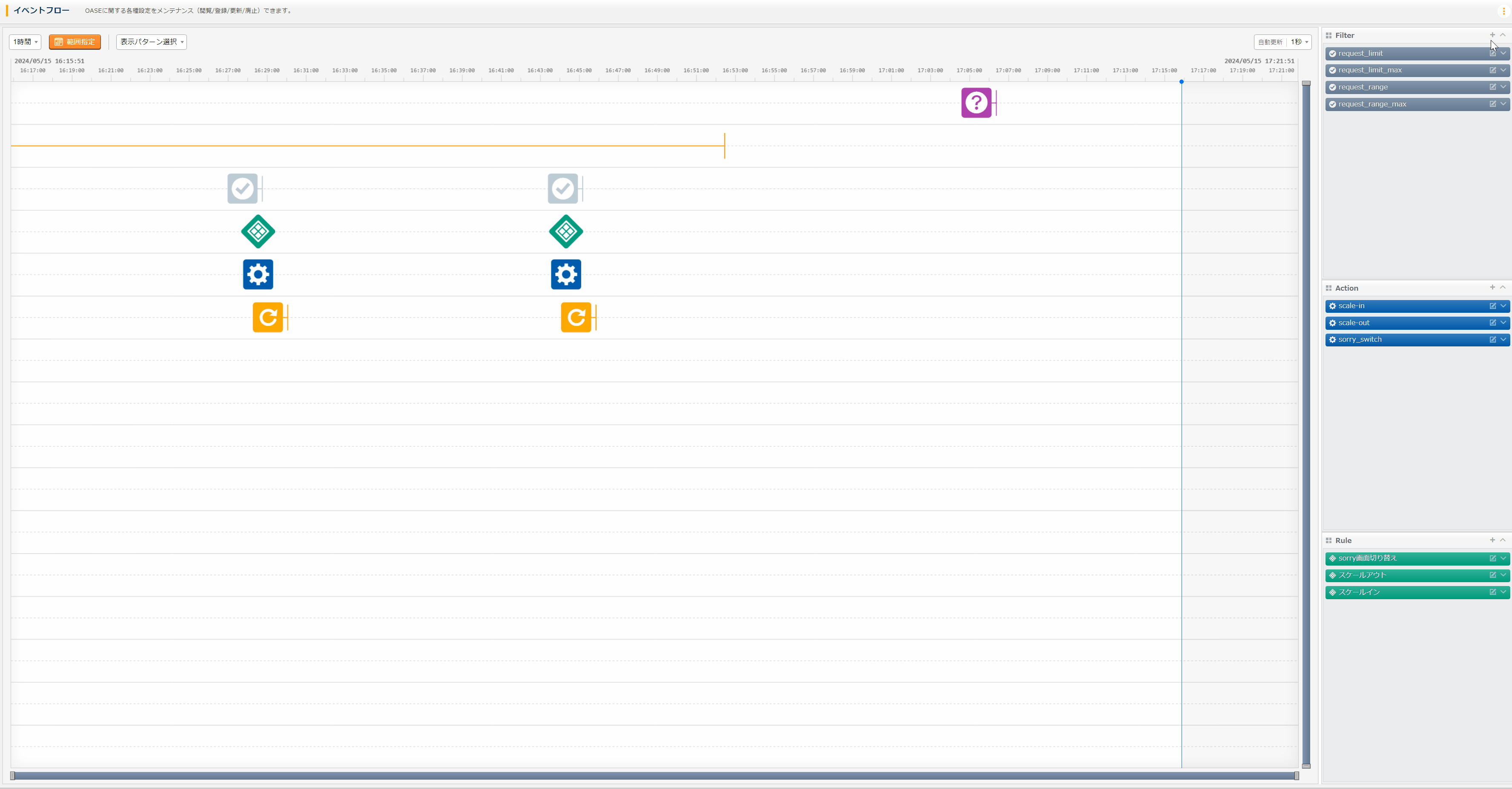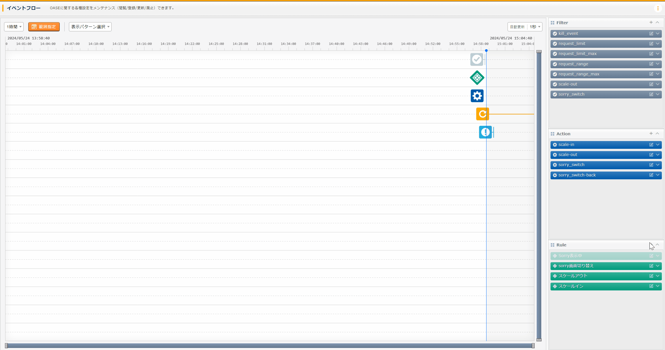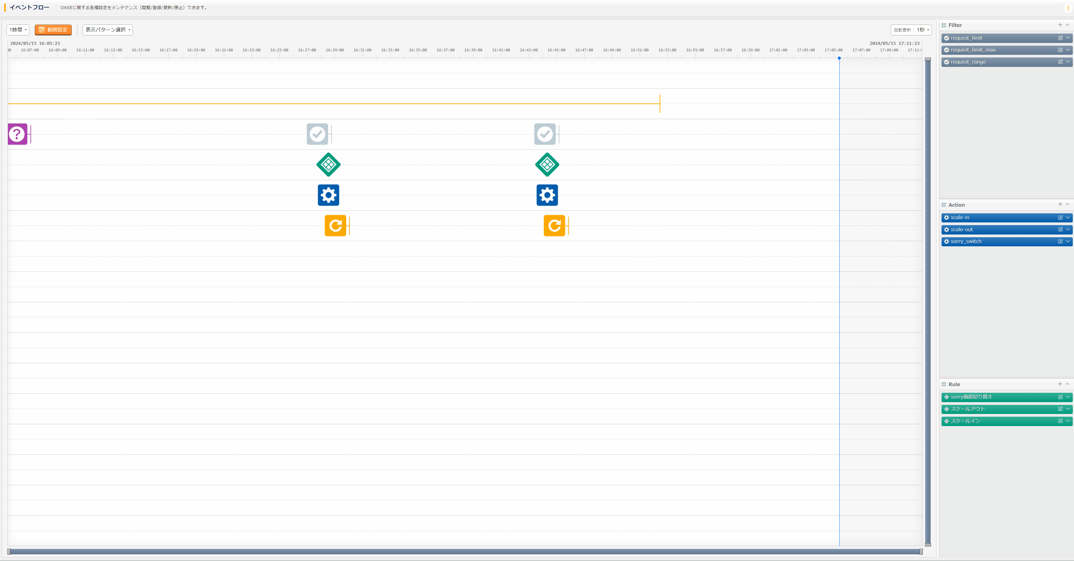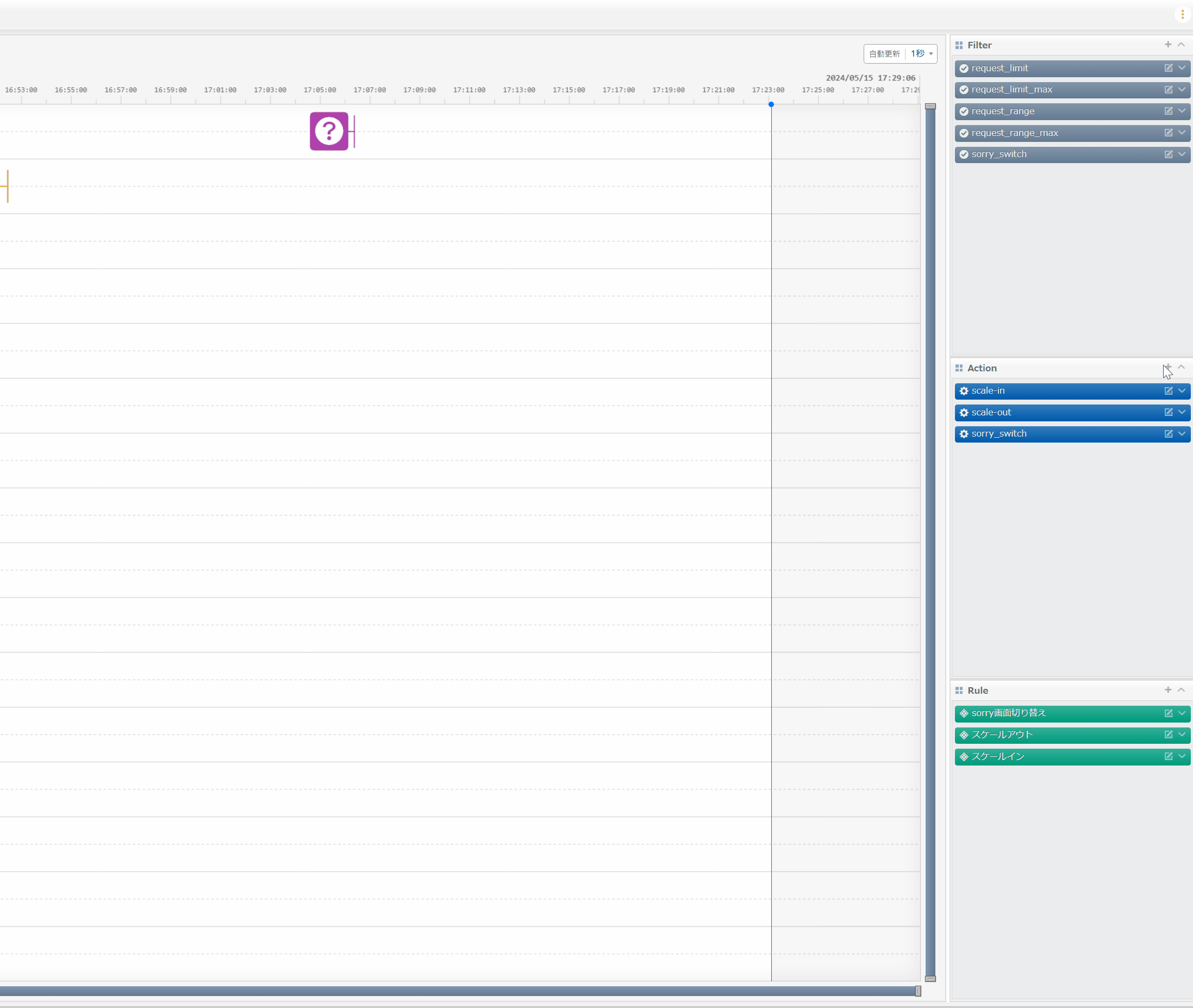 すでに3台稼働し、Sorry画面に切り替わっている状況において、リクエスト数が3台稼働時の閾値150リクエスト/min内に回復したとき。