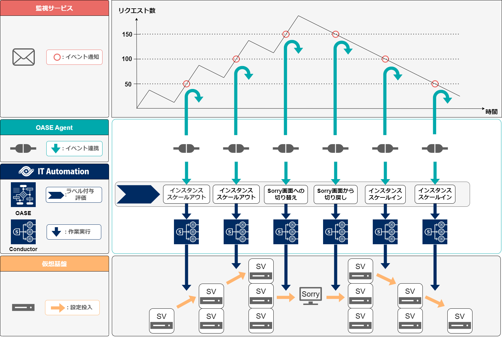 リクエスト数に関するメール通知をイベントとして、イベント発生に合わせて4.・5.・6.の保守作業を行うよう、OASEの設定を行います。
