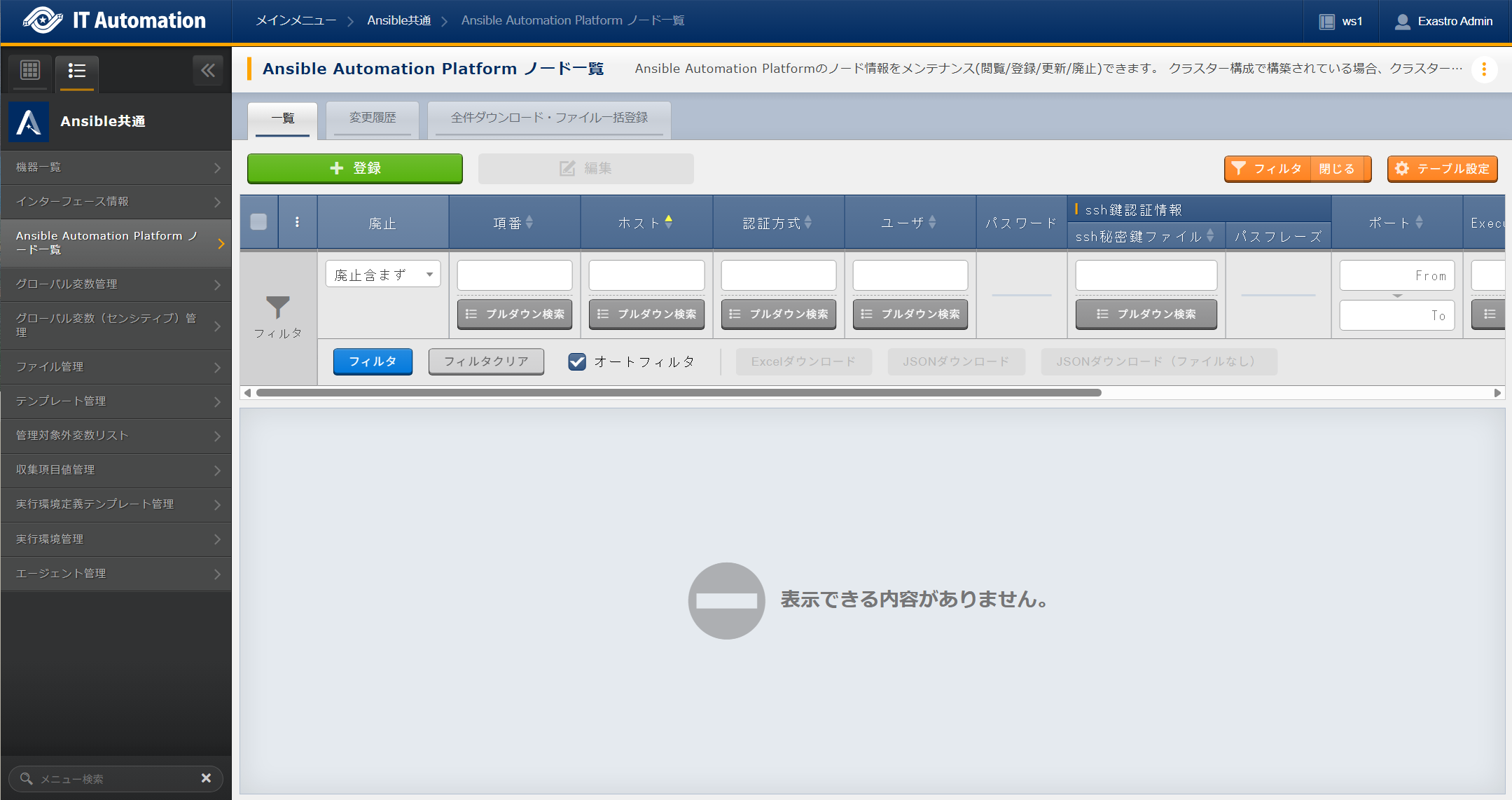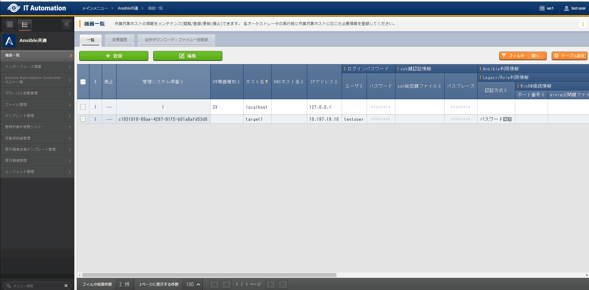 - Legacy モードAnsible標準の機能を用いて各種ホストへ設定を投入します。構築コードを単体YAMLファイルとして登録し、作業パターンをその組み合わせで構成します。サーバ・ストレージ・ネットワーク各機器の環境設定などの作業用に使われることを想定します。