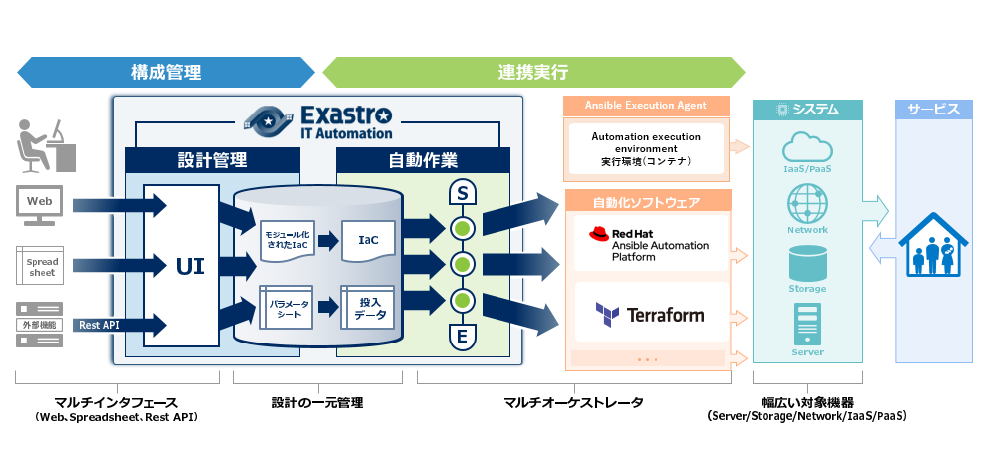 - Pioneer モードAnsibleに独自モジュールを追加し、対話形式による設定投入を可能とします。Telnet, SSHでログイン可能なサーバ・ストレージ・ネットワーク各機器に対応しています。作業対象と直接やり取りが必要となるため、相応のITスキルが必要となります。