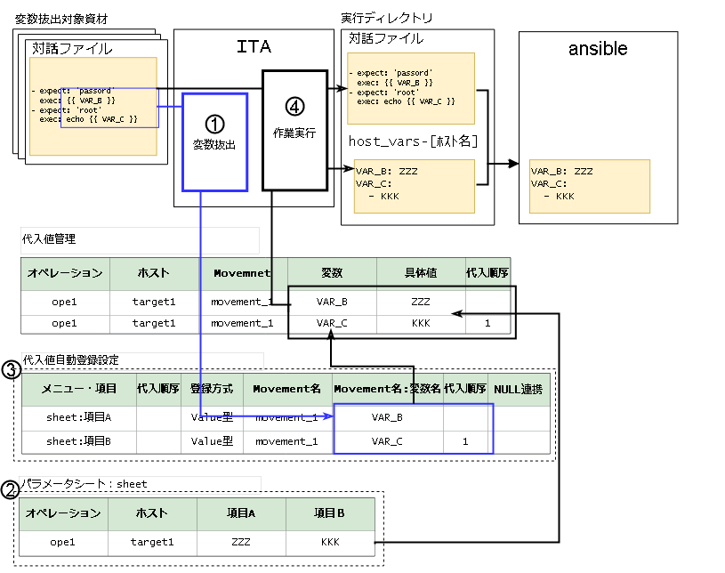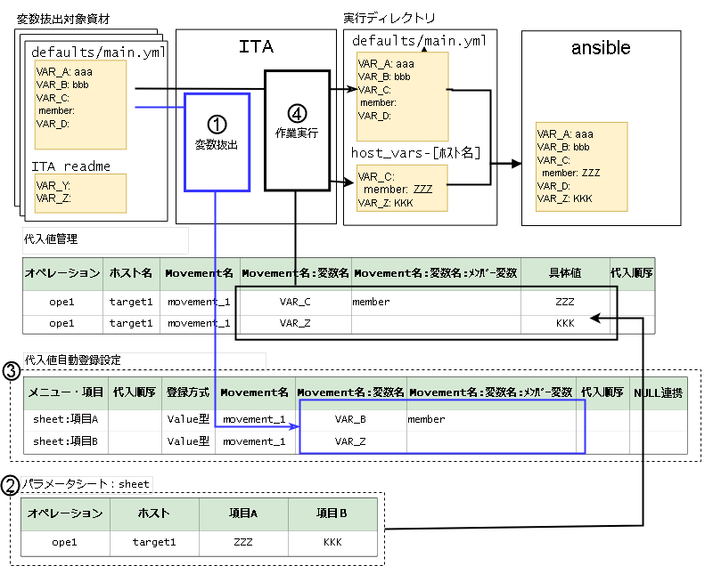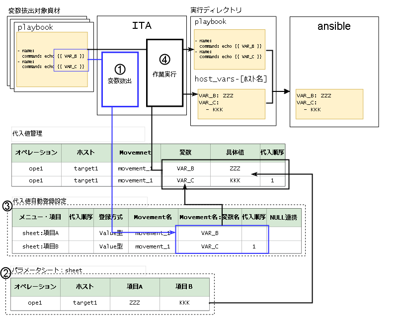 ・EXTRA_VARS:変数名、具体値をjson形式またはyaml形式
