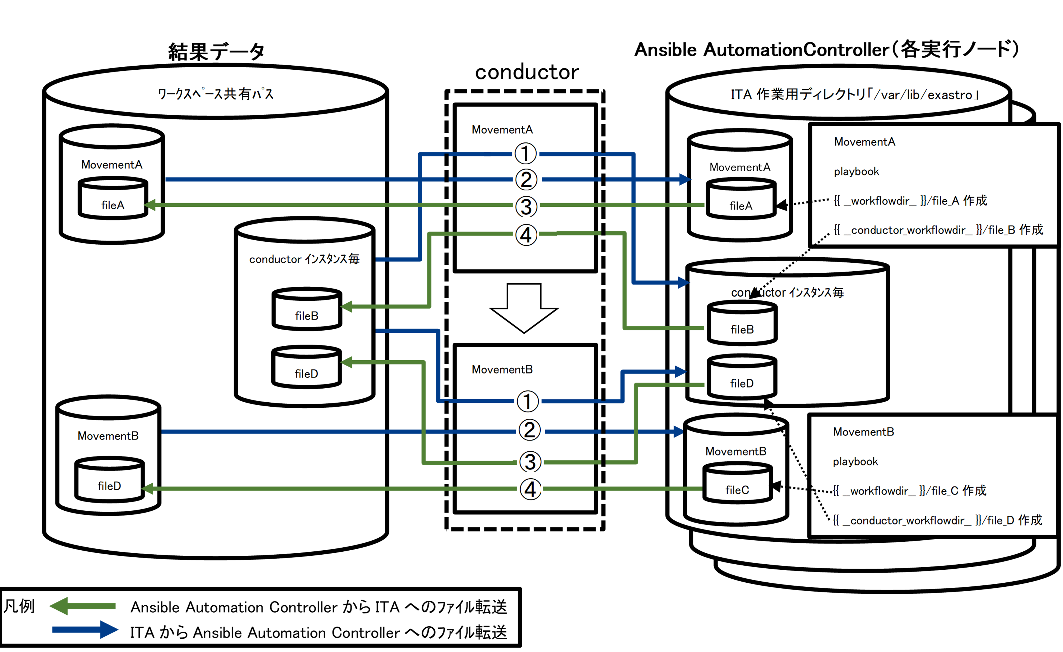 - Movementをconductorから実行している場合、Movement実行後にAnsible Automation Controller(各実行ノード)のITA作業用ディレクトリの該当Movementで作成したファイルを結果データにファイル転送