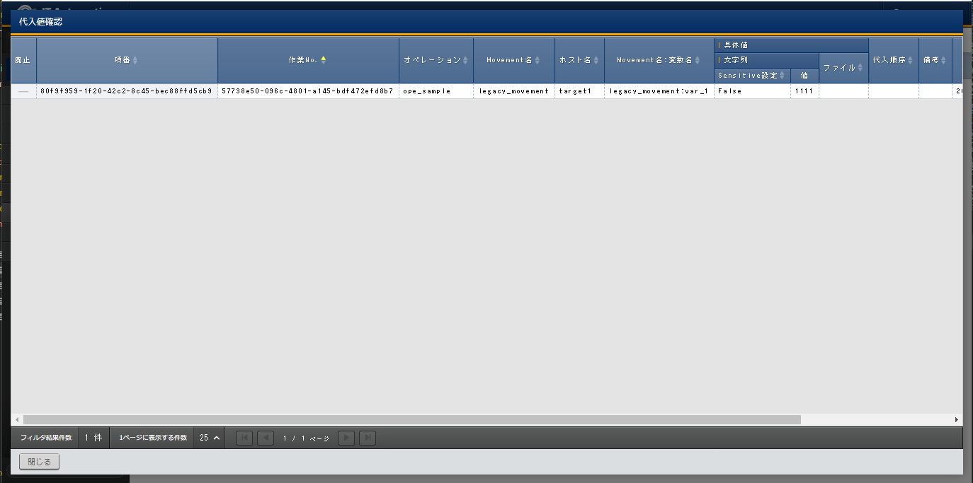 作業実行毎の変数の具体値を表示します。 |