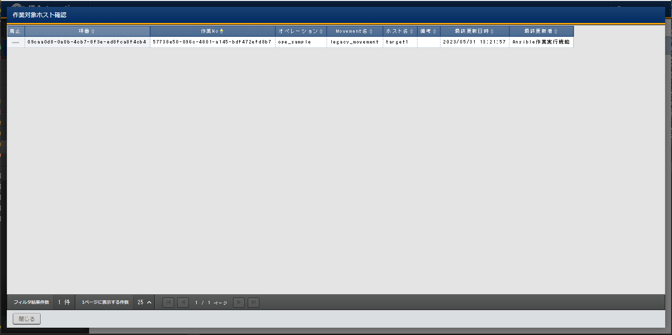 作業実行毎の作業対象ホストを表示します。 |