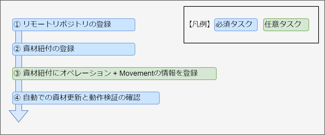 - 資材紐付機能紐付元資材と紐付先資材の紐付を登録し、紐付先資材の動作検証を行う為のオペレーションとMovementを登録します。紐付元資材が更新されると、紐付先資材が自動更新され、動作検証を行う為のオペレーションとMovementで作業実行を行います。
