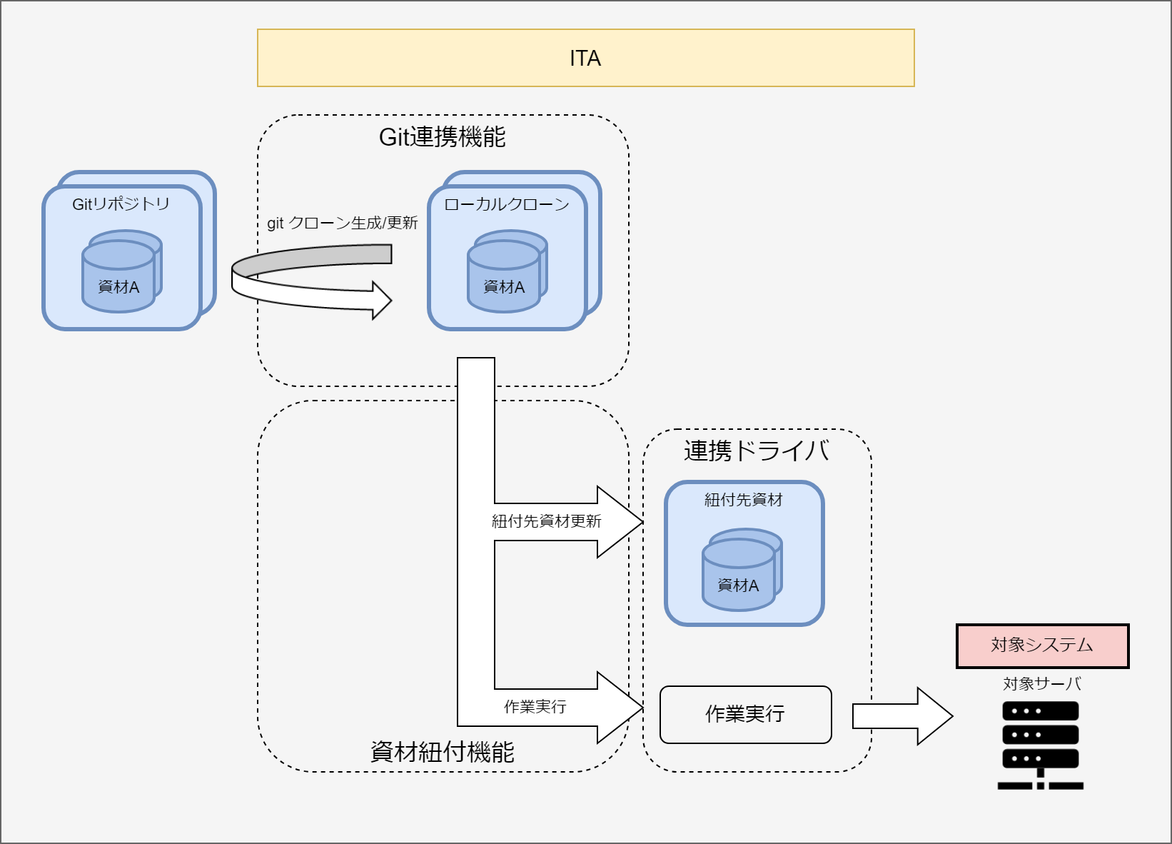 - Git連携機能ITA内にGitリポジトリのクローンを作成します。クローンを介して定期的に紐付元資材の更新を検知しITAの「リモートリポジトリ資材」メニューに一覧を作成します。
