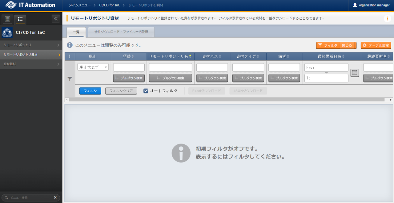 - 「リモートリポジトリ資材」メニューには、紐付元資材の一覧が表示されます。「リモートリポジトリ資材」メニューに表示される情報は内部機能で更新しています。レコード追加・更新・削除は行わないで下さい。