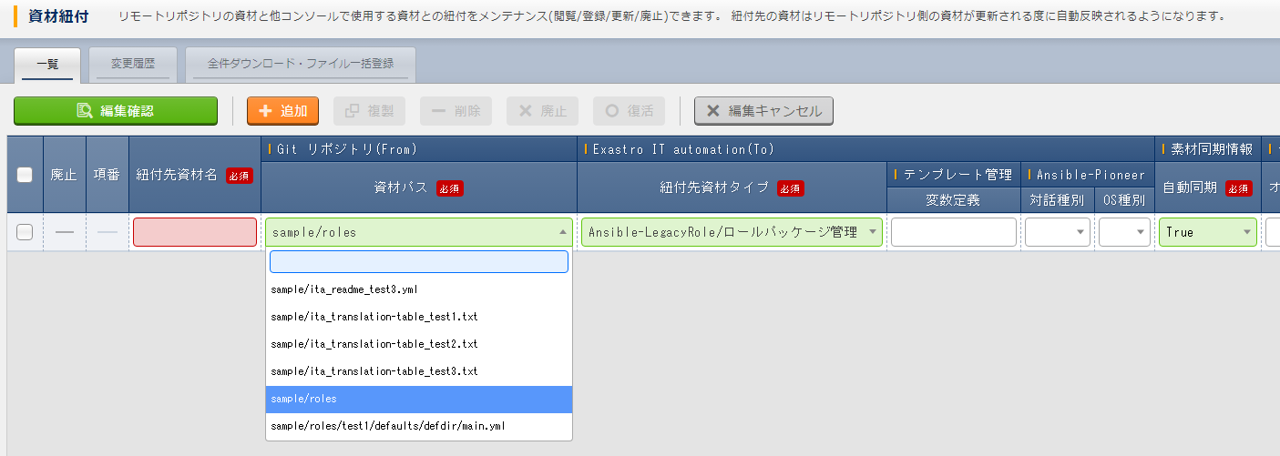 紐付先資材タイプが「Ansible-LegacyRole/ロールパッケージ管理」メニューの場合、「ロールパッケージ管理に紐付する資材をGitリポジトリに登録する場合の注意事項」を参照してください。
