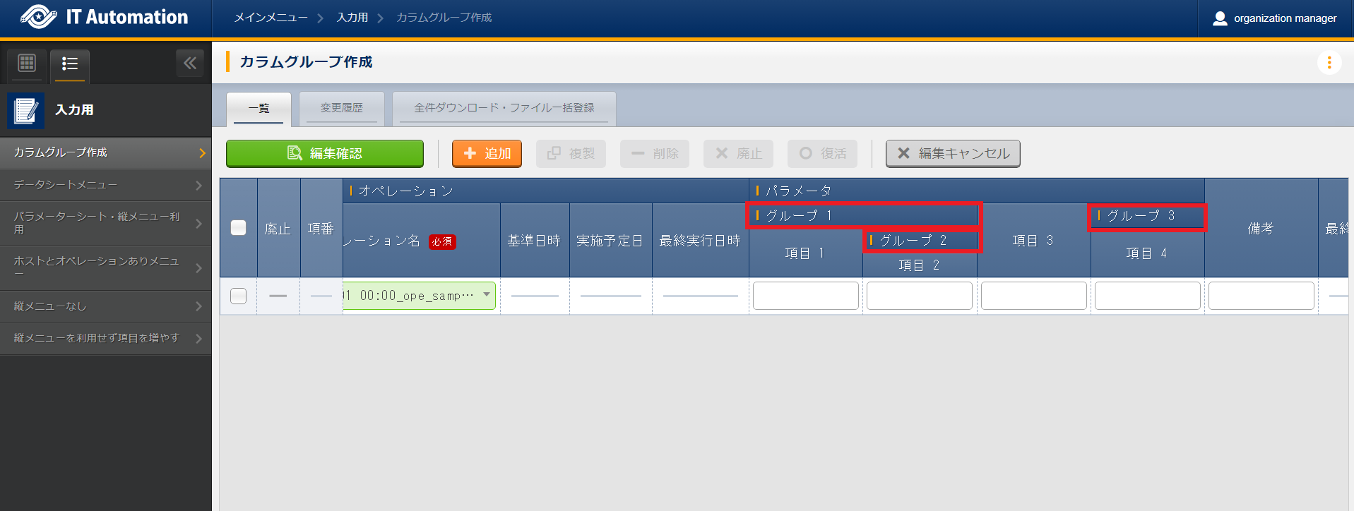 作成するパラメータシートまたはデータシートのカラムグループをメンテナンス(参照/更新/廃止/復活)できます。