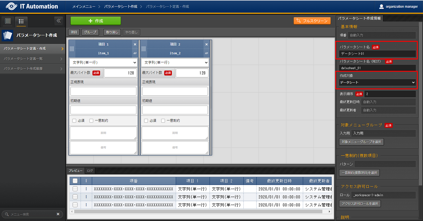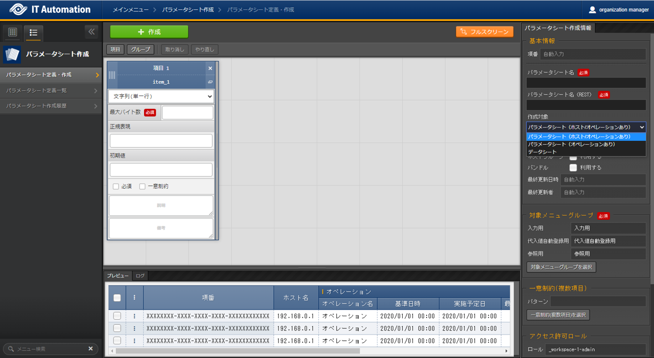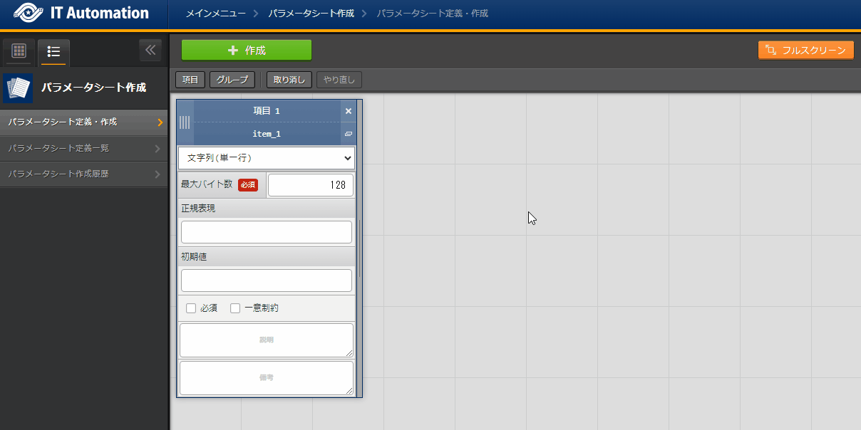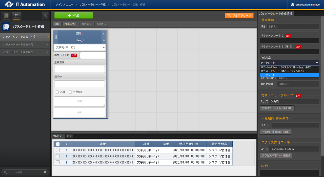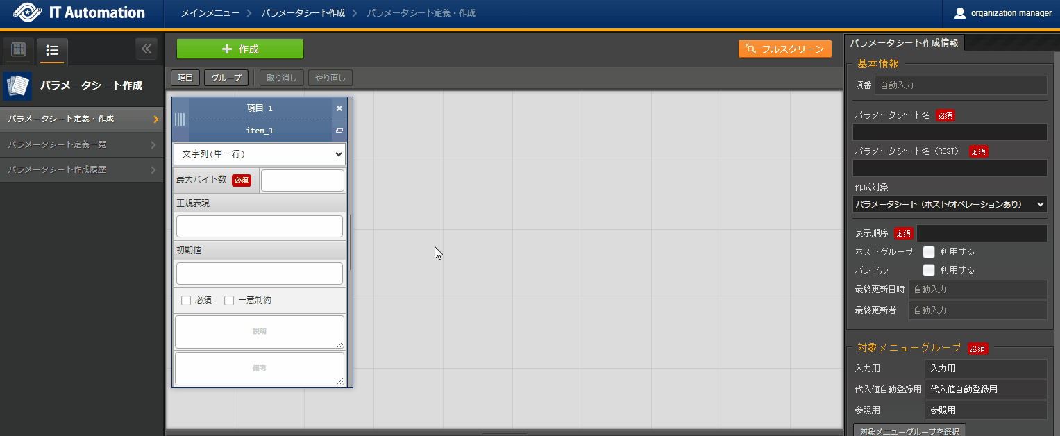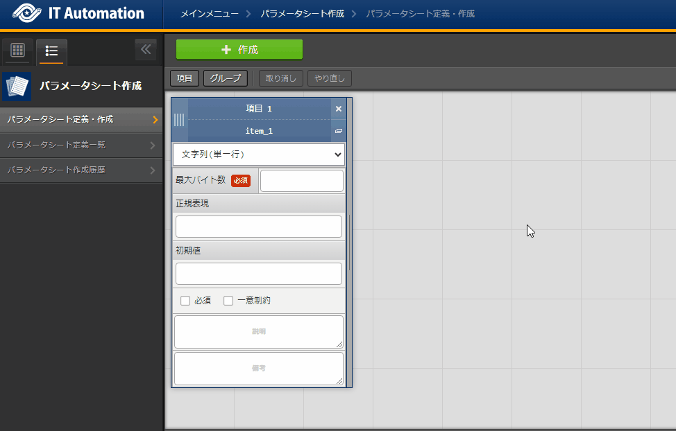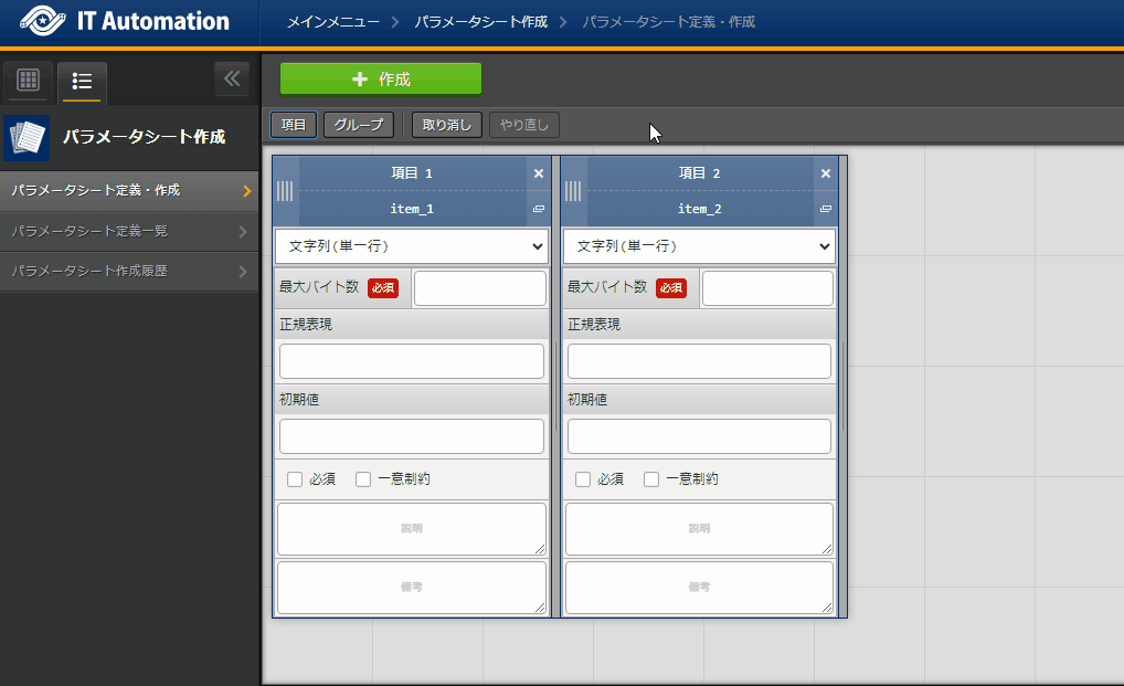 パラメータシートまたはデータシートとそれに紐づく項目を作成することが可能です。