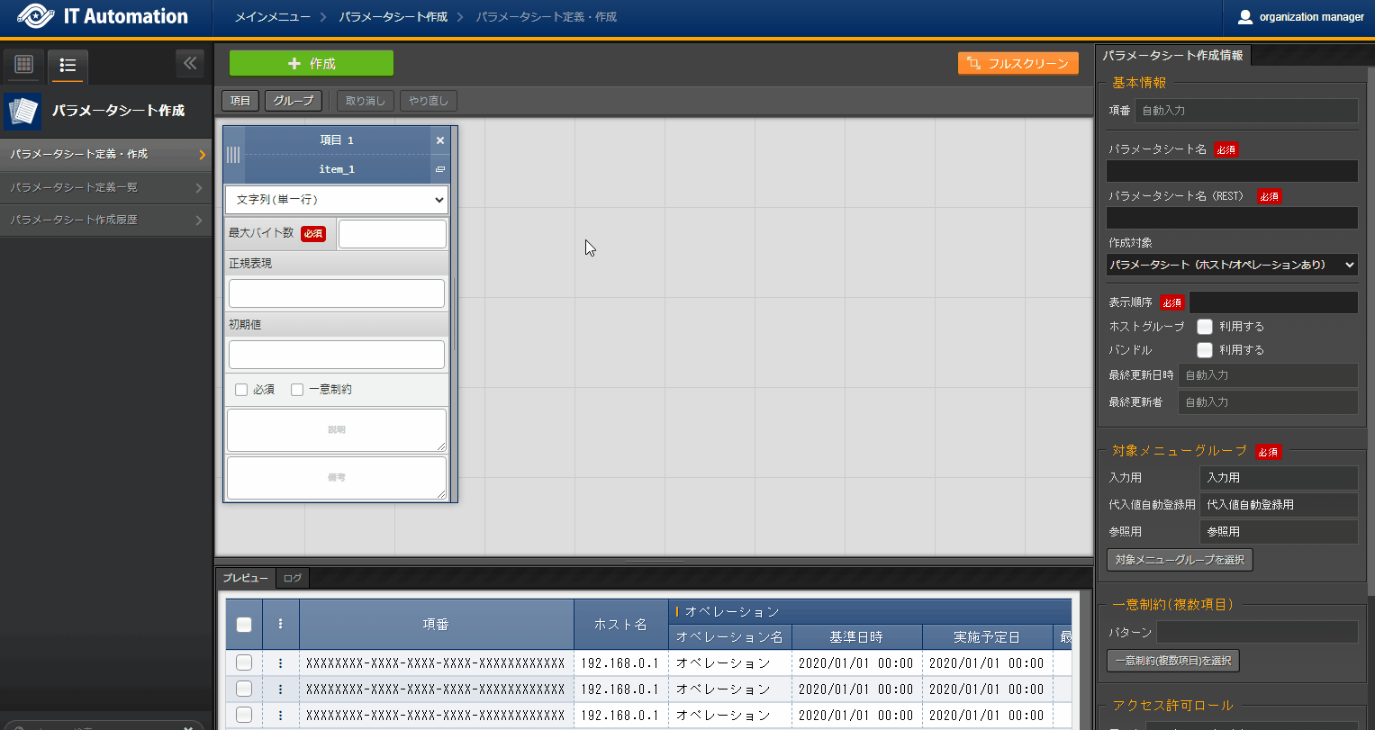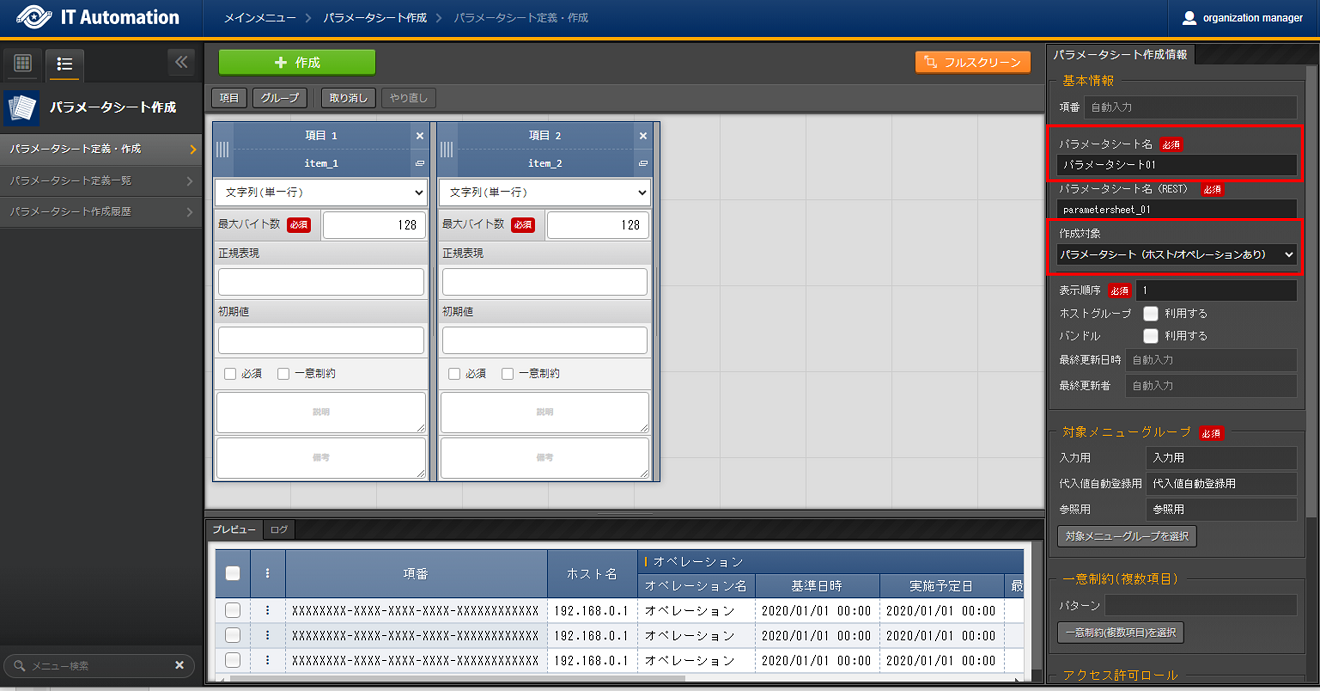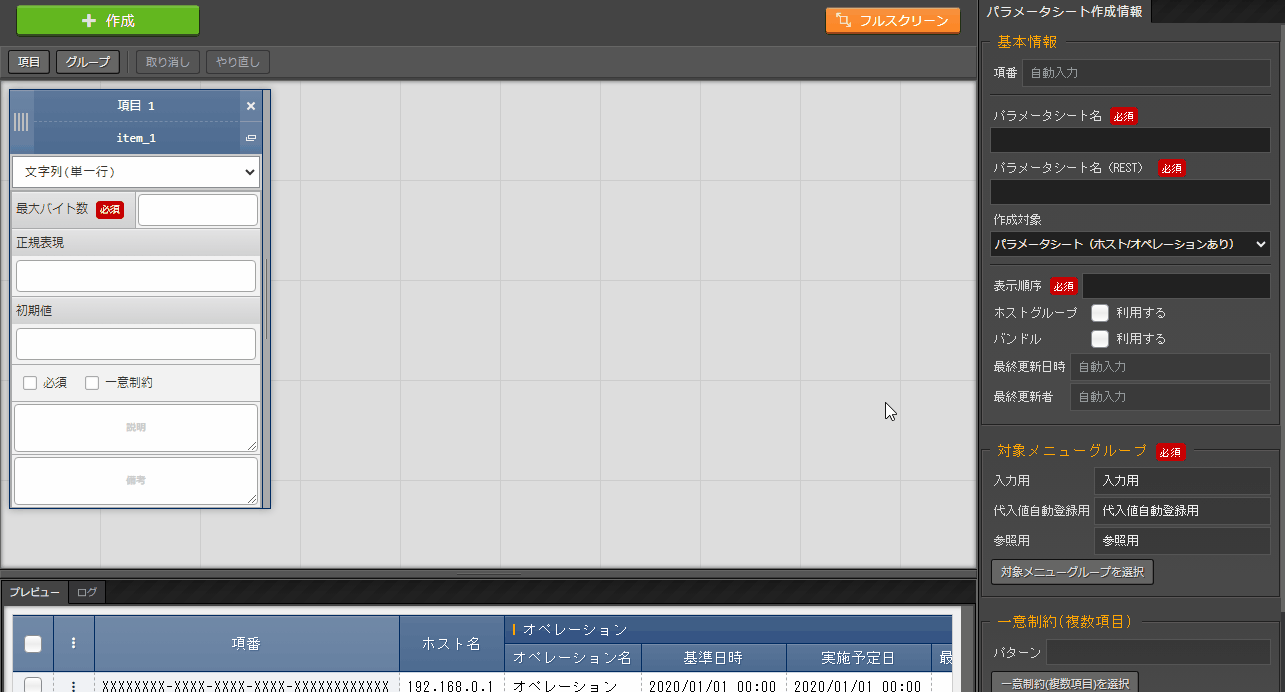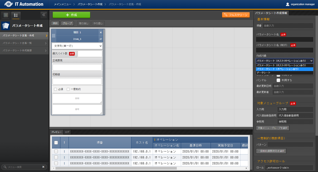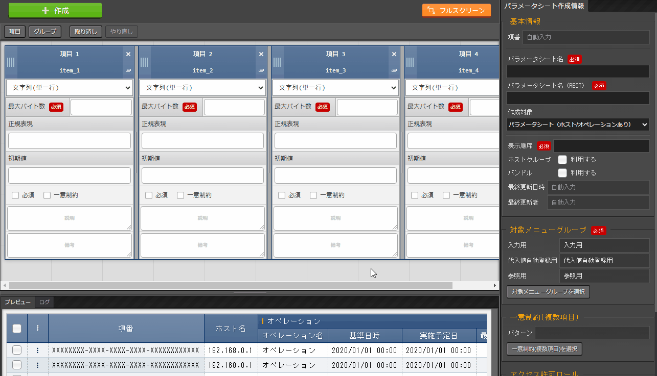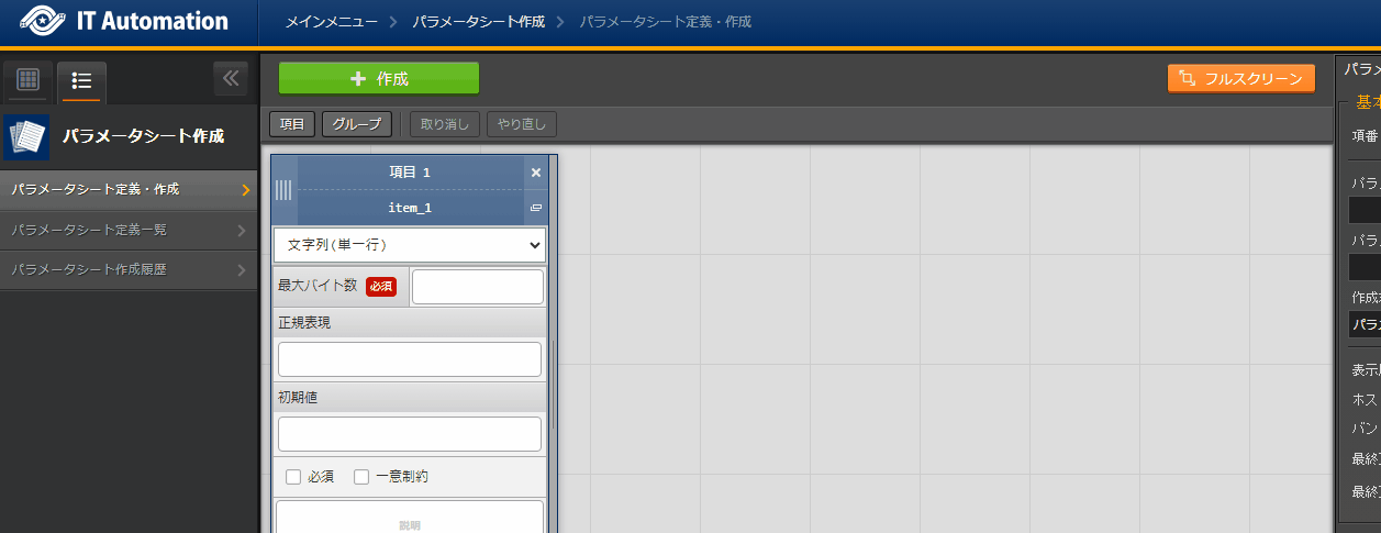 パラメータシートまたはデータシートとそれに紐づく項目を作成することが可能です。