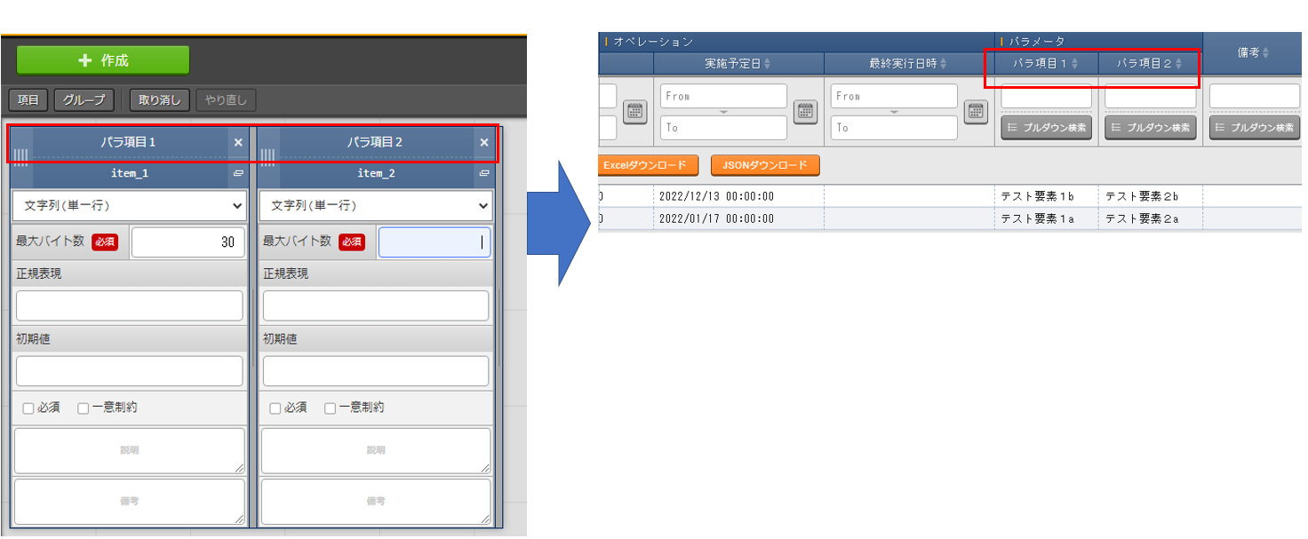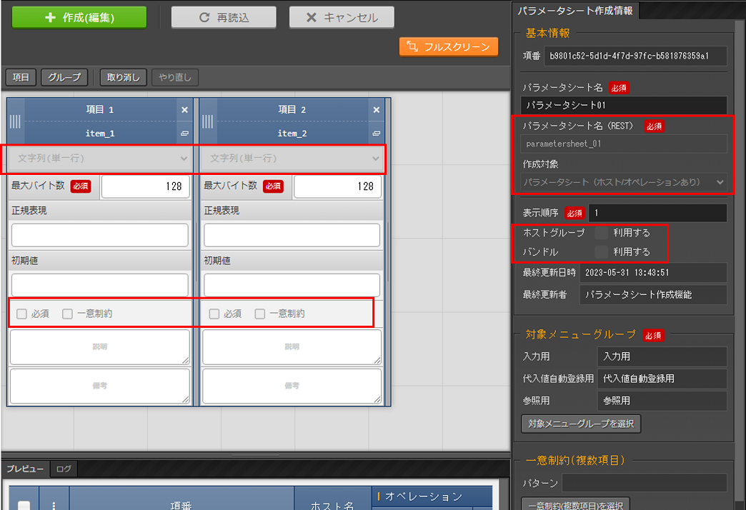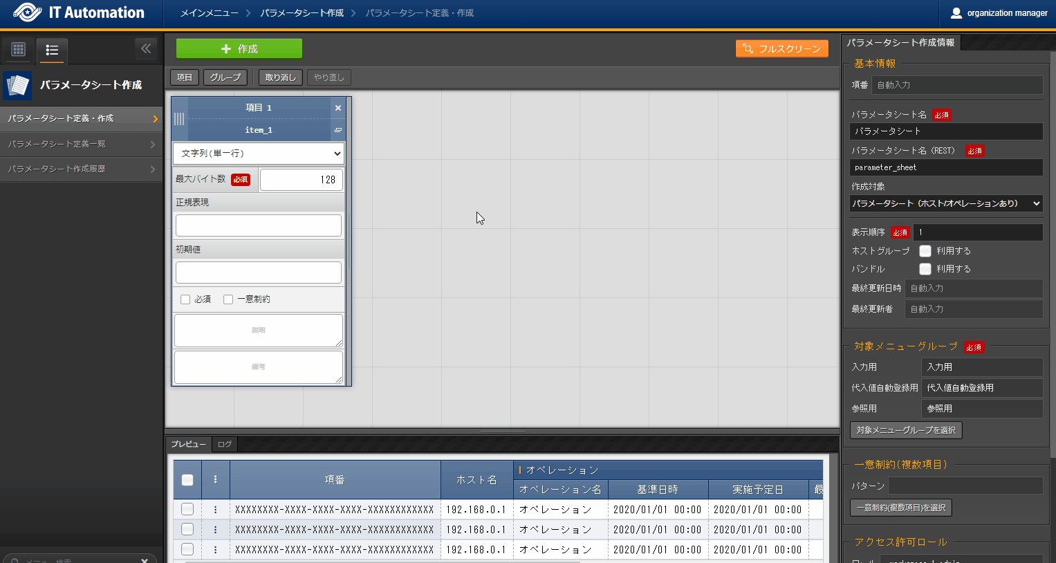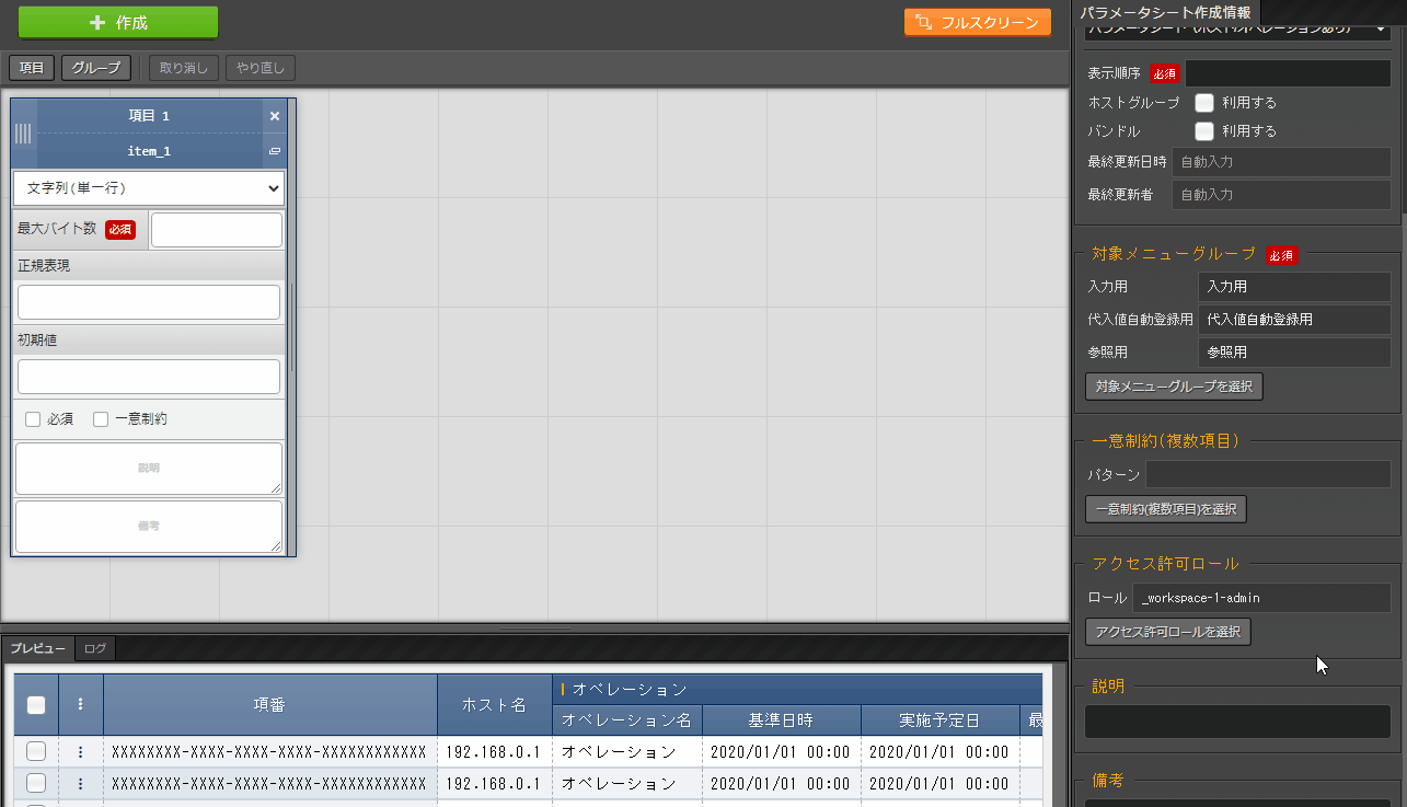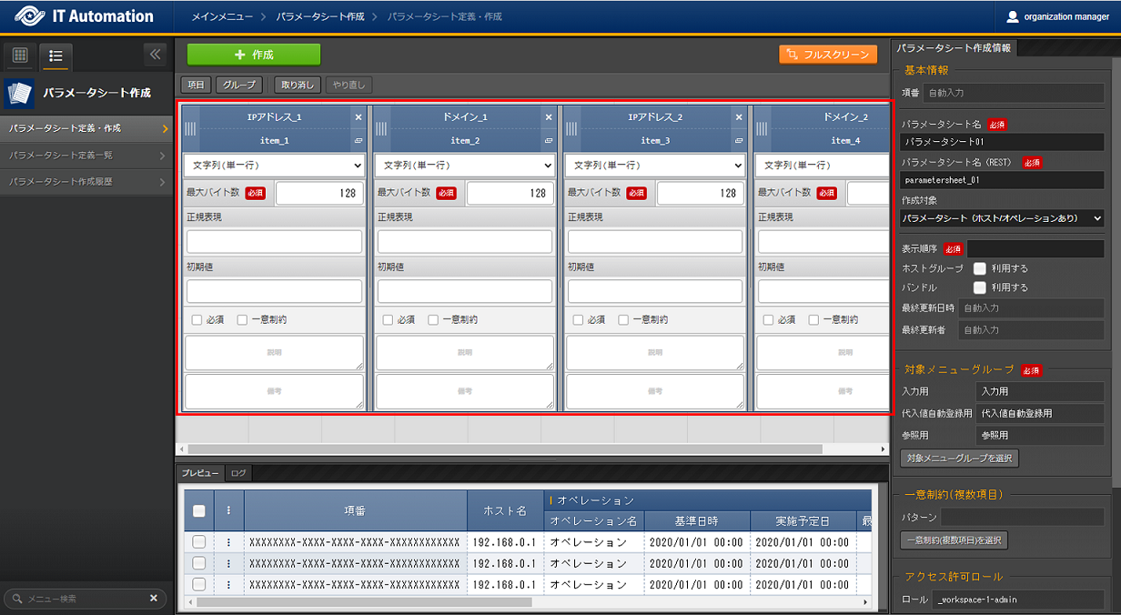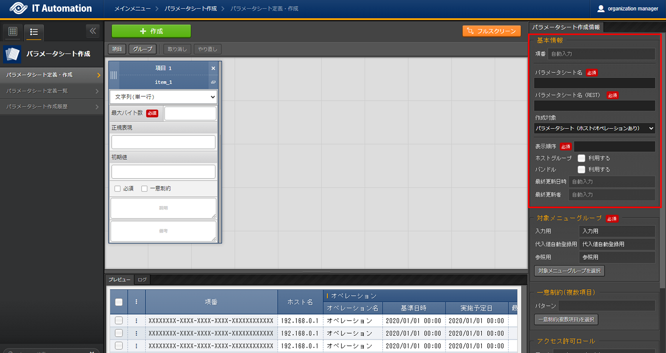 パラメータシートまたはデータシートとそれに紐づく項目を作成することが可能です。