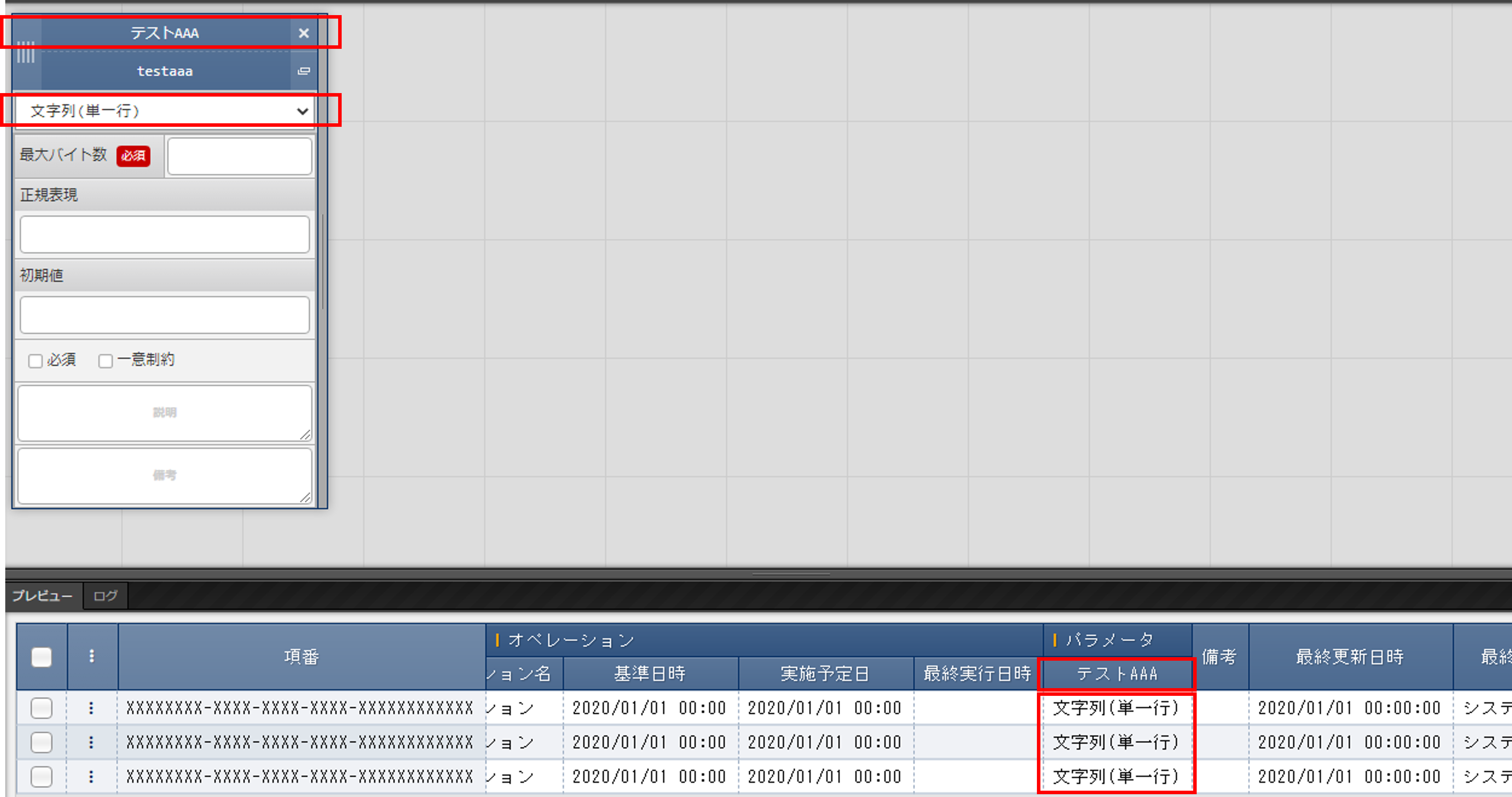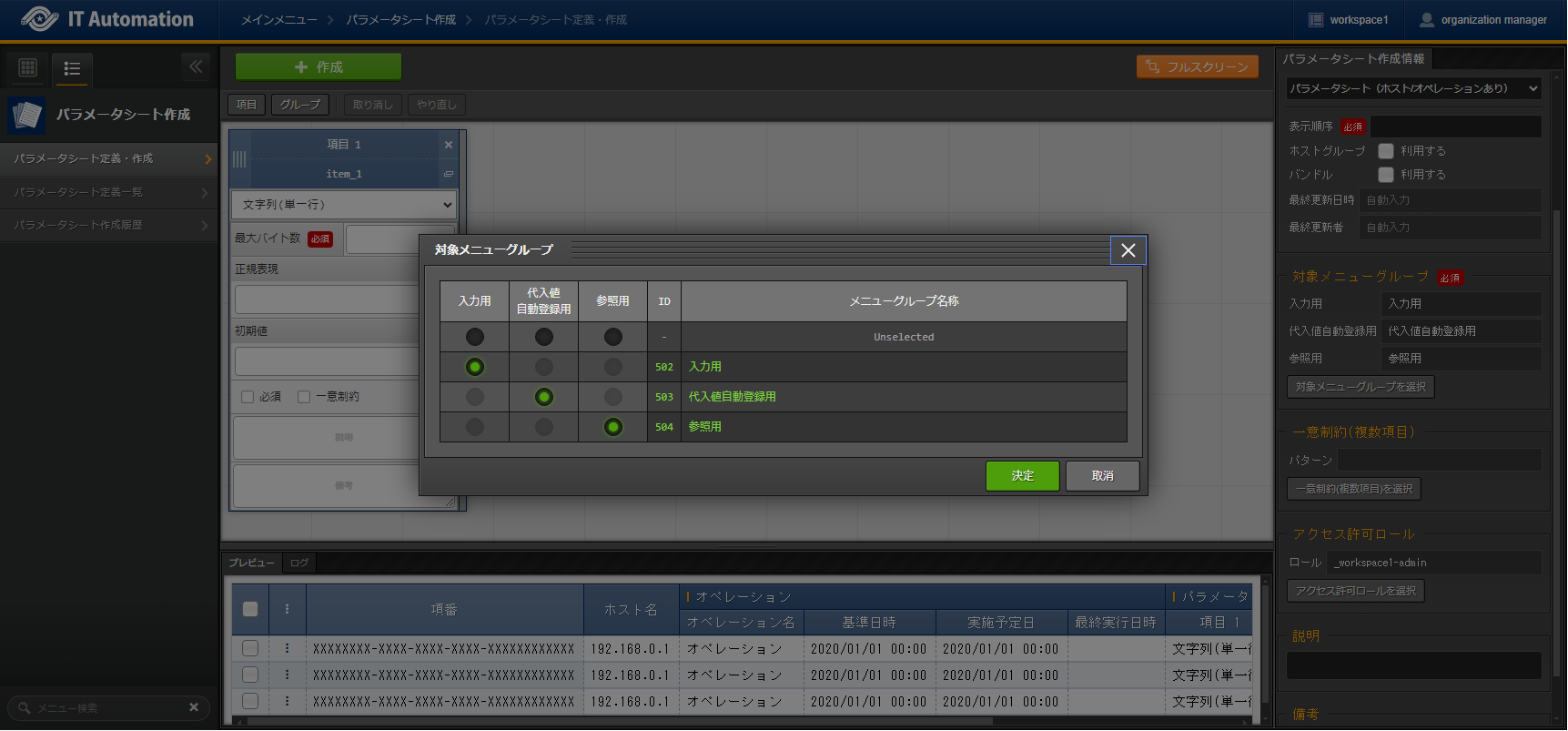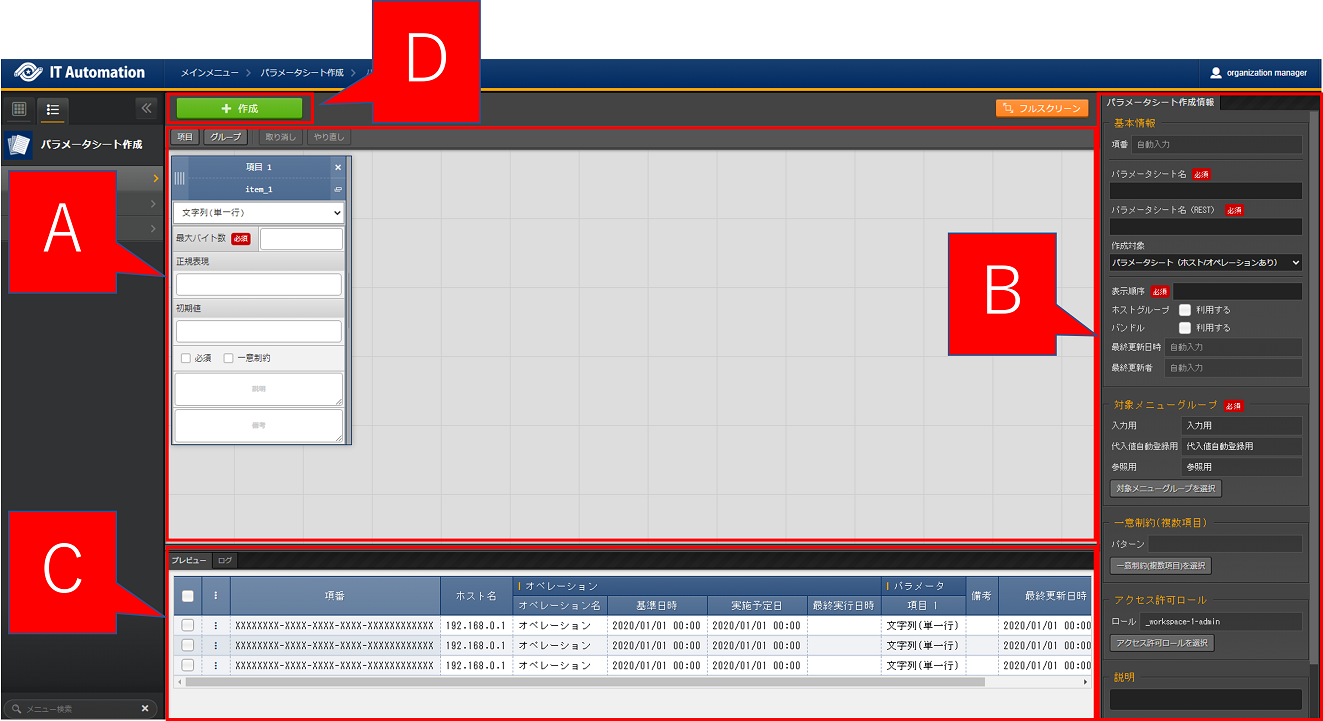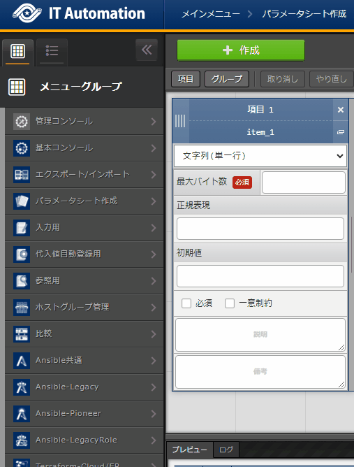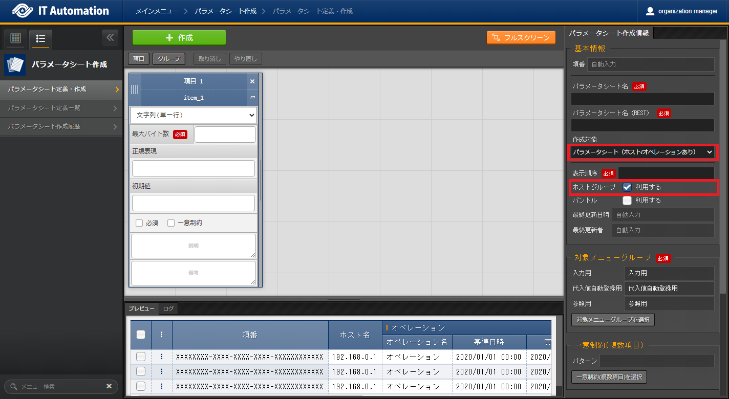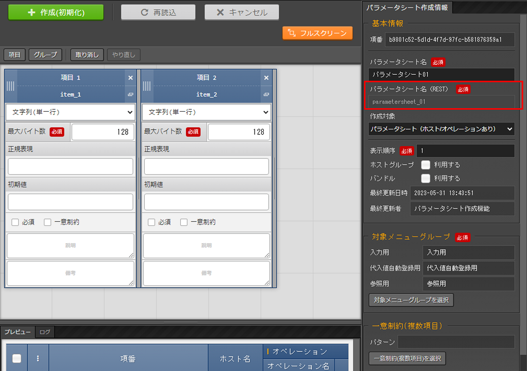 パラメータシートまたはデータシートとそれに紐づく項目を作成することが可能です。
