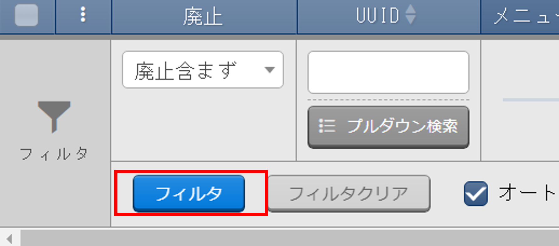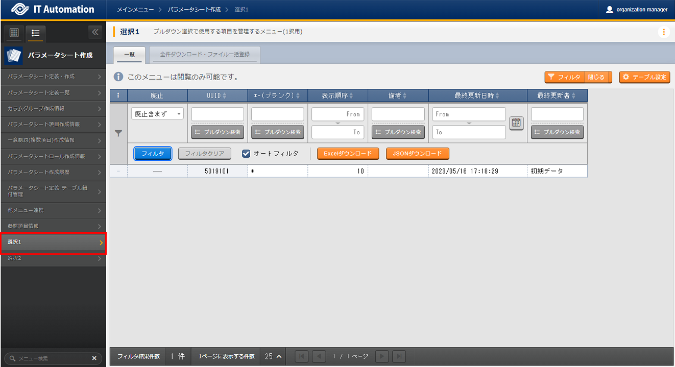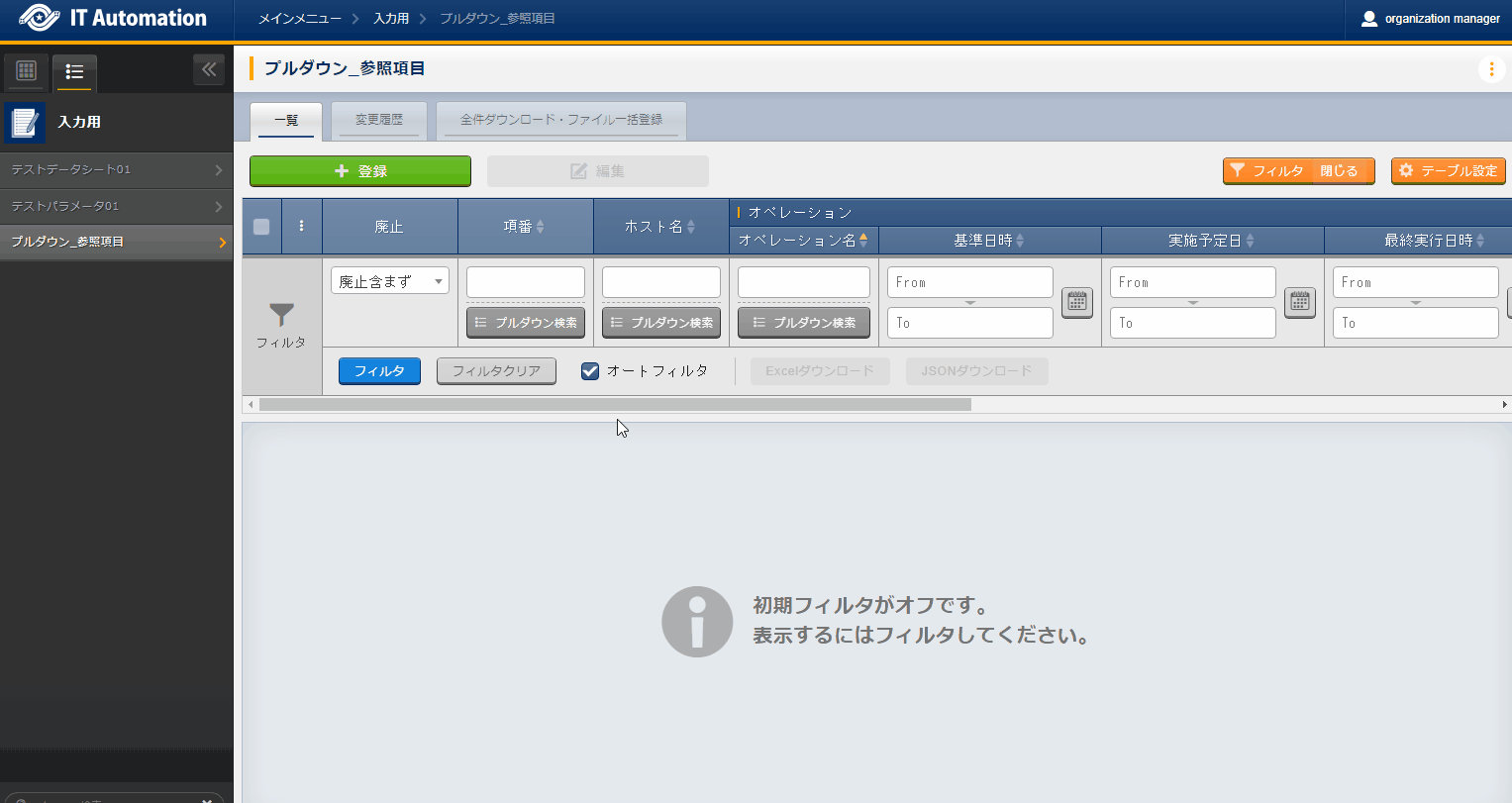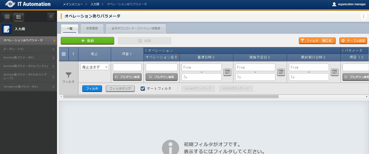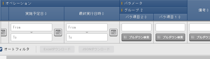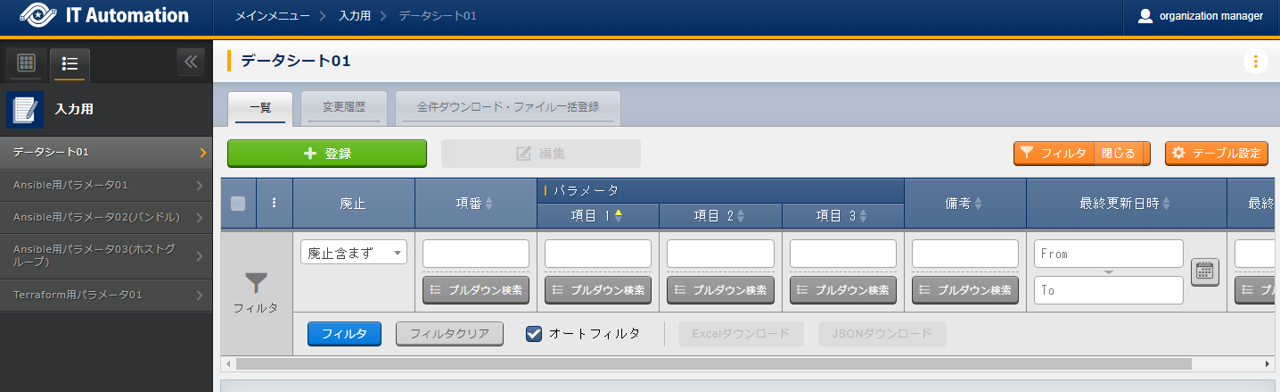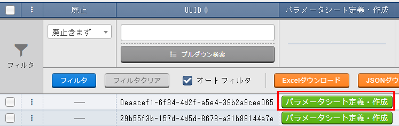 フィルタ ボタンを押下し、以下の項目を利用して、対象のパラメータシートを検索してください。