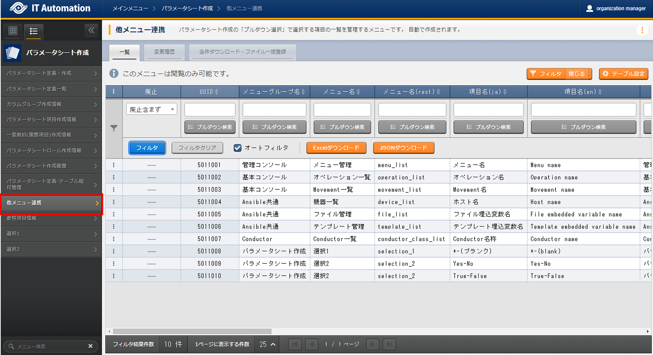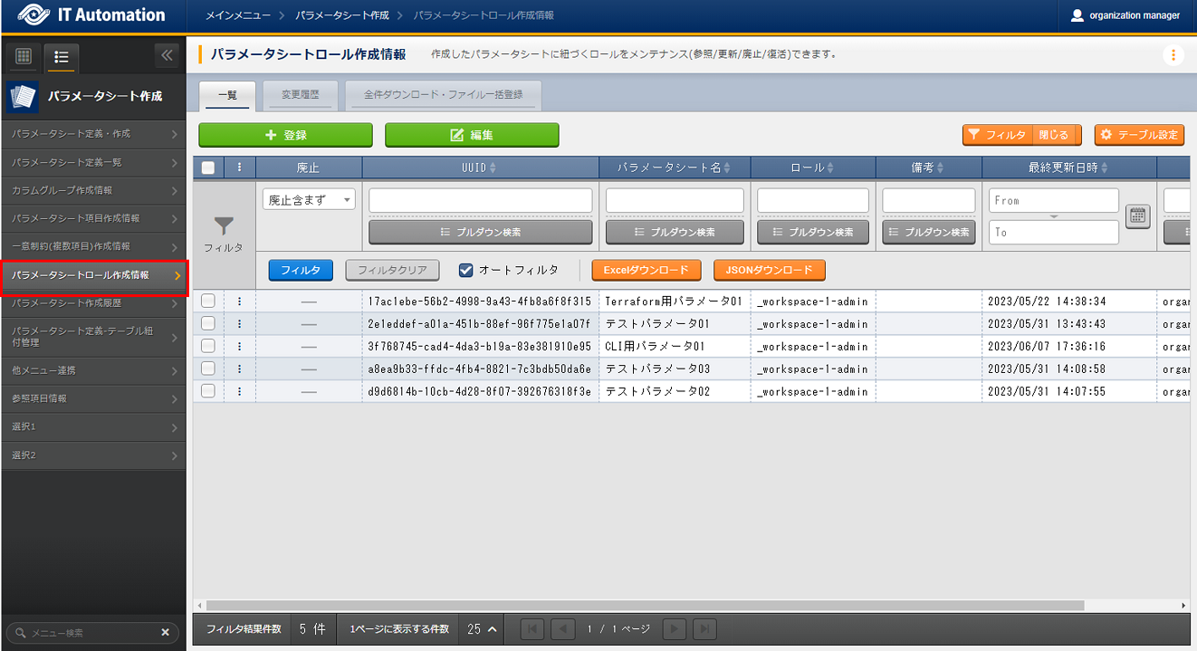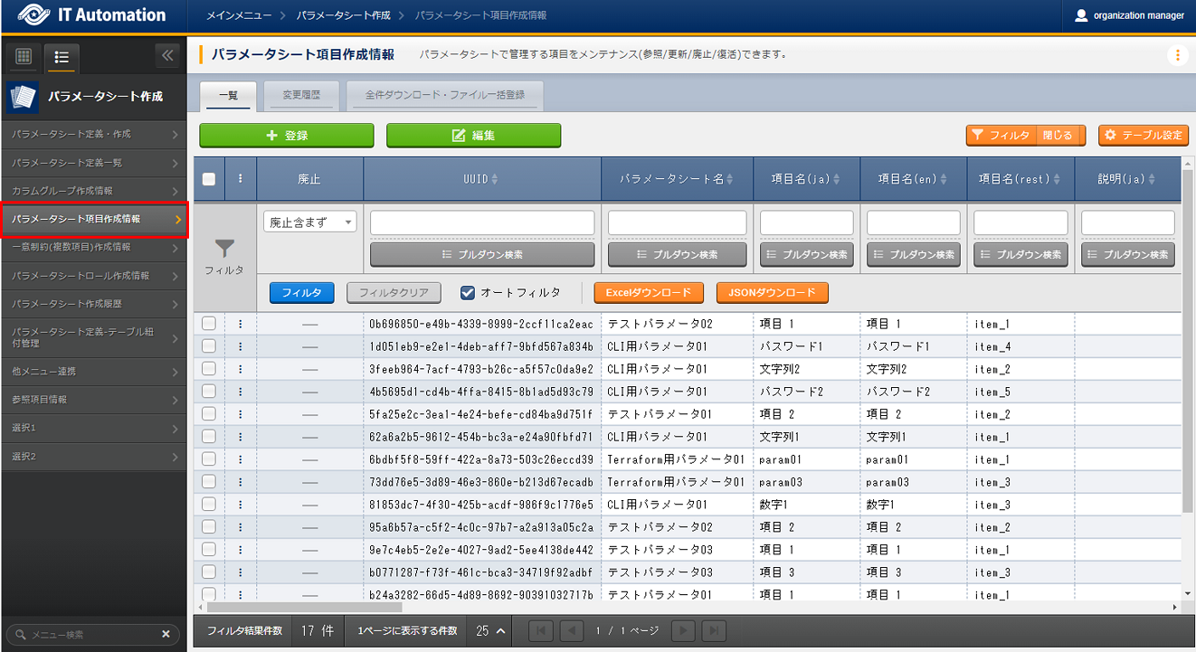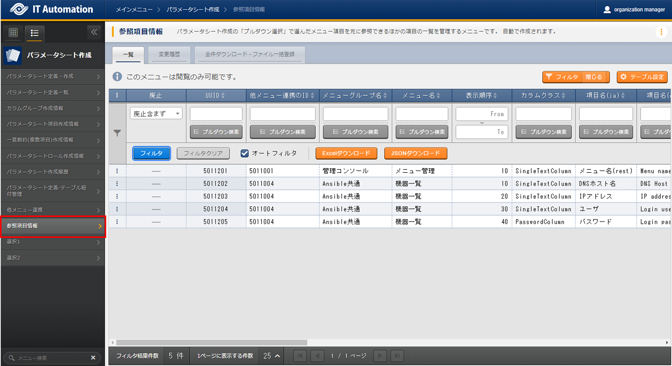 - 「パラメータシート定義・作成」メニューでパラメータシートおよびデータシートを作成する場合、「パラメータシート定義一覧」「カラムグループ管理」「メニュー項目作成情報」の各メニューへデータが自動で登録されるため、各メニュー内でデータを作成する必要はありません。