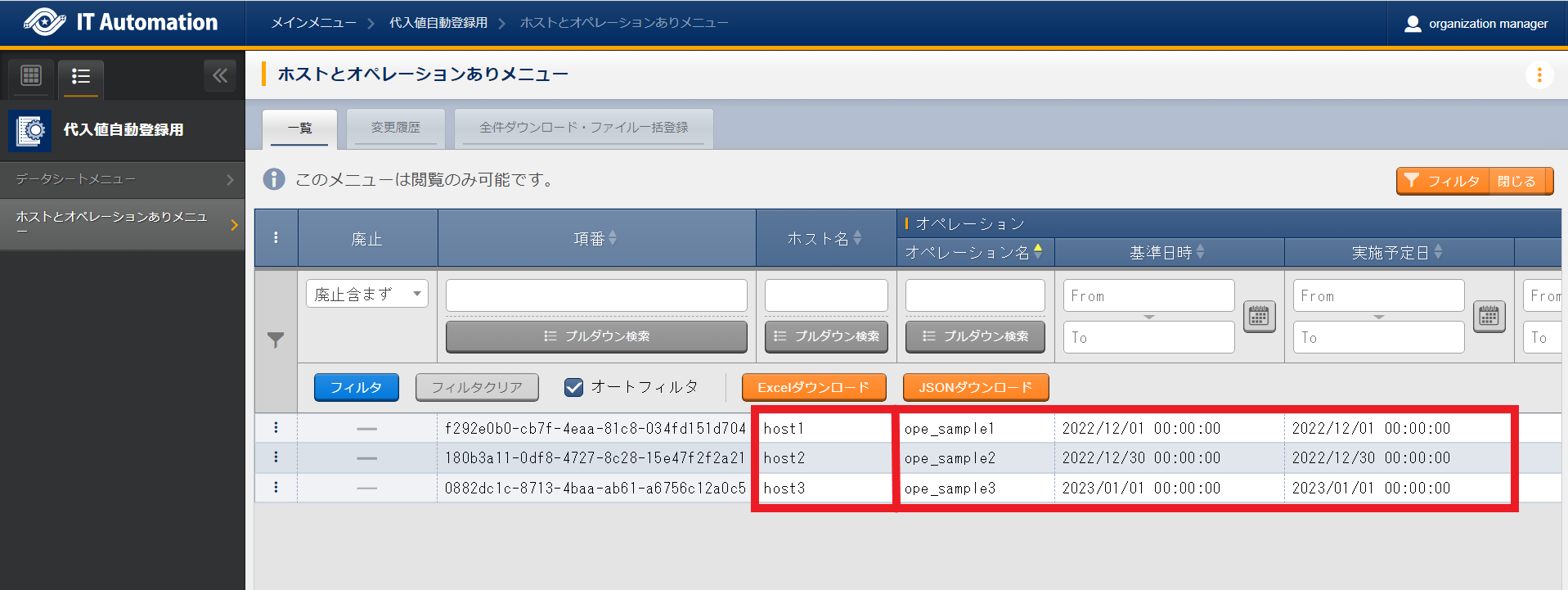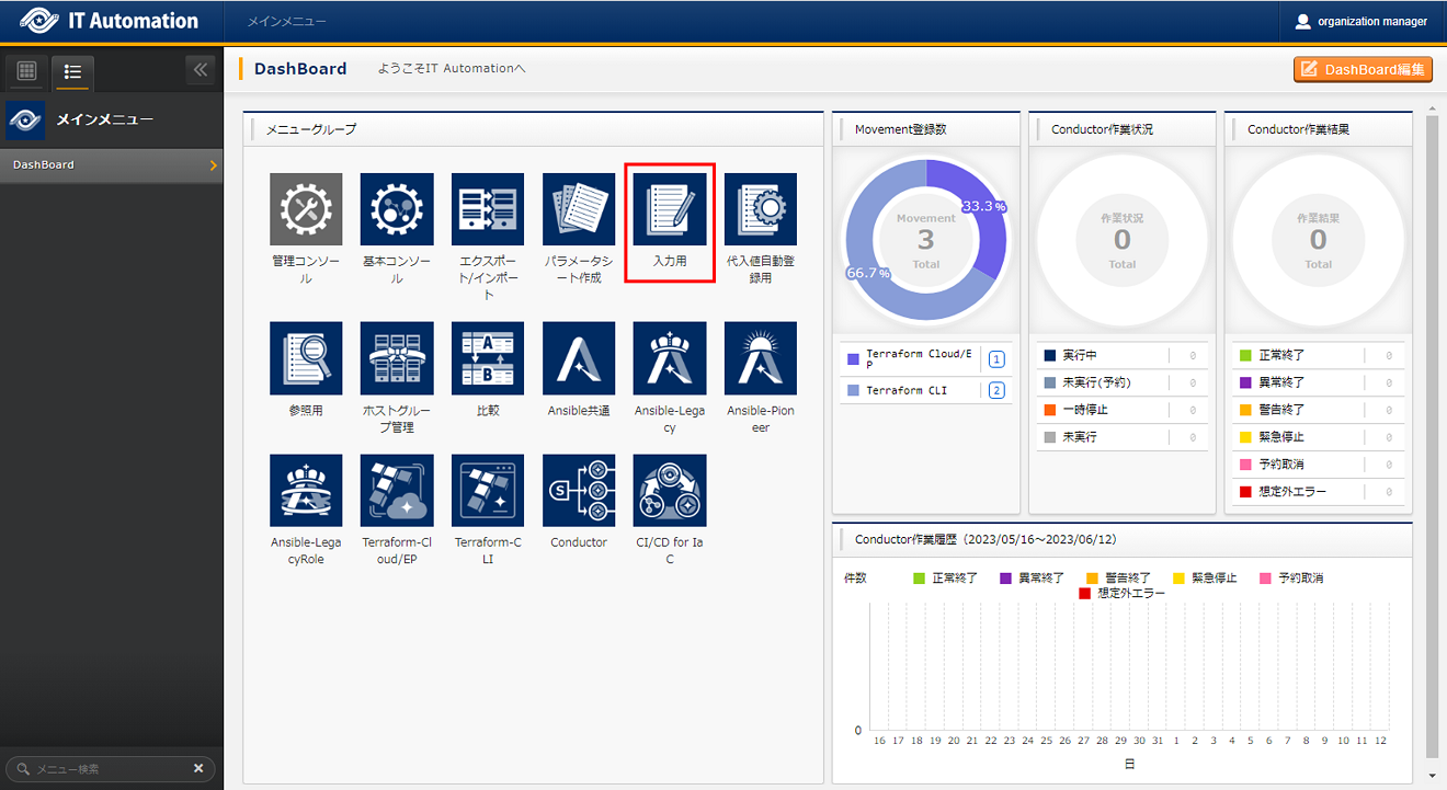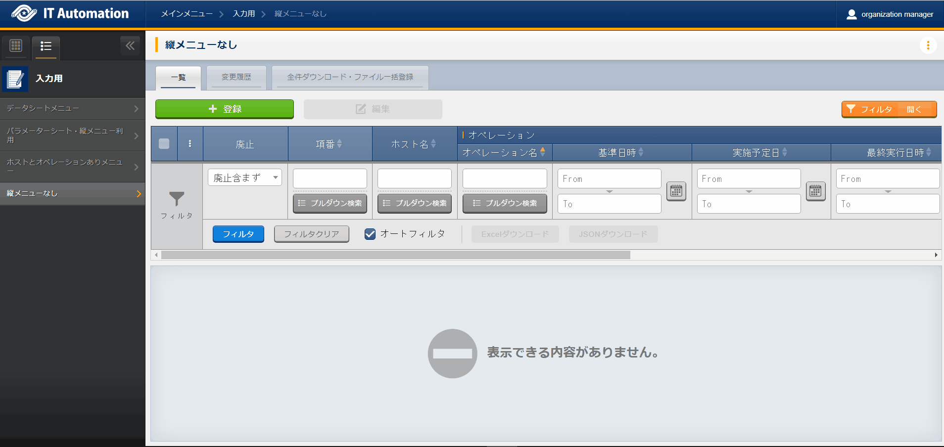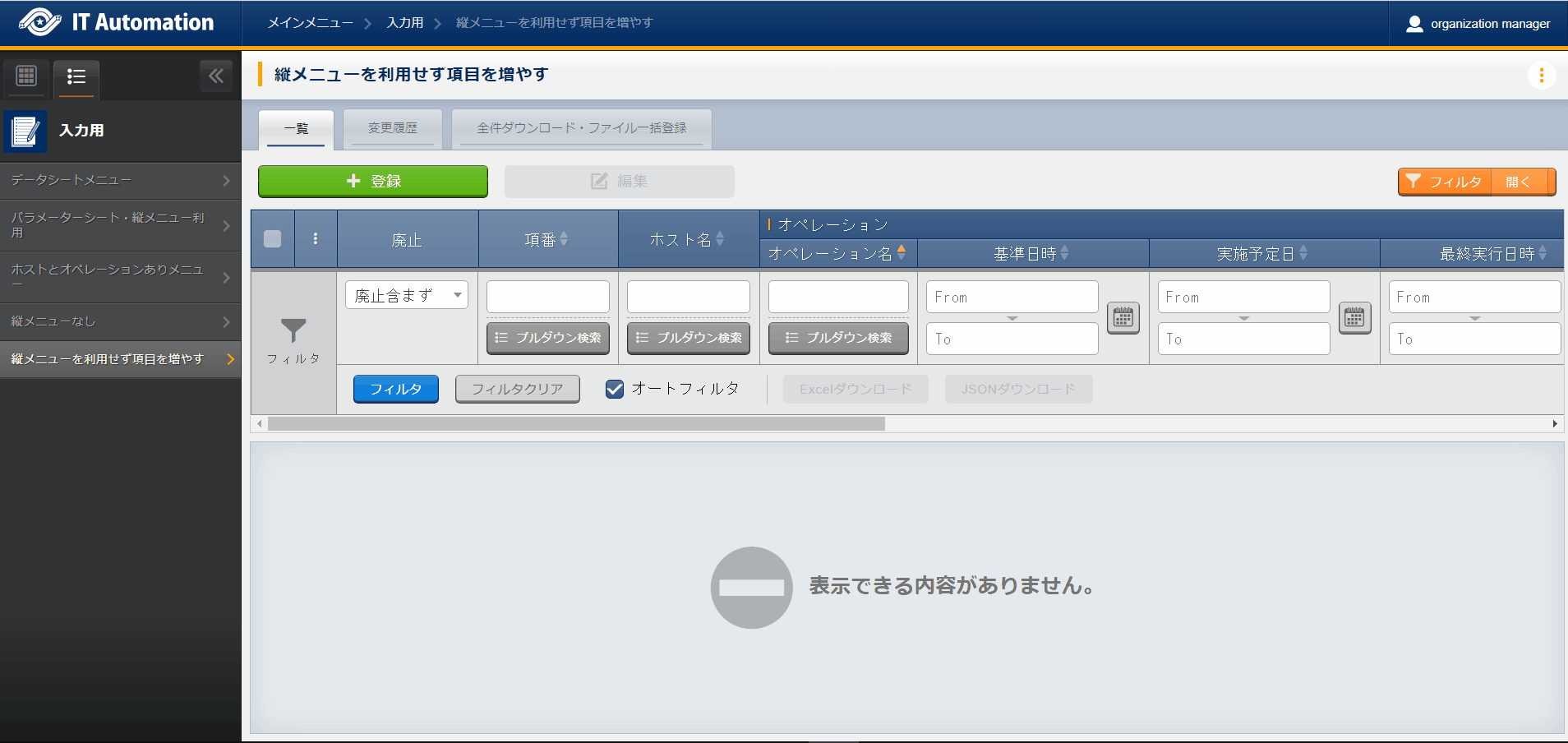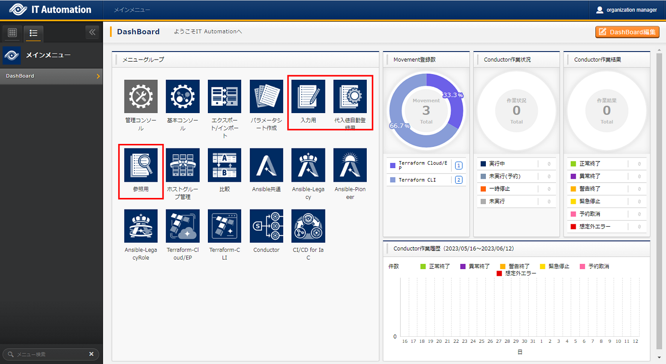 - 非表示になっているメニューを使用したい場合は、「ロール・メニュー紐付管理」で対象のメニューを復活させてください。(復活/廃止の手順は 「Exastro-ITA_利用手順マニュアル_管理コンソール」 を参照してください。)