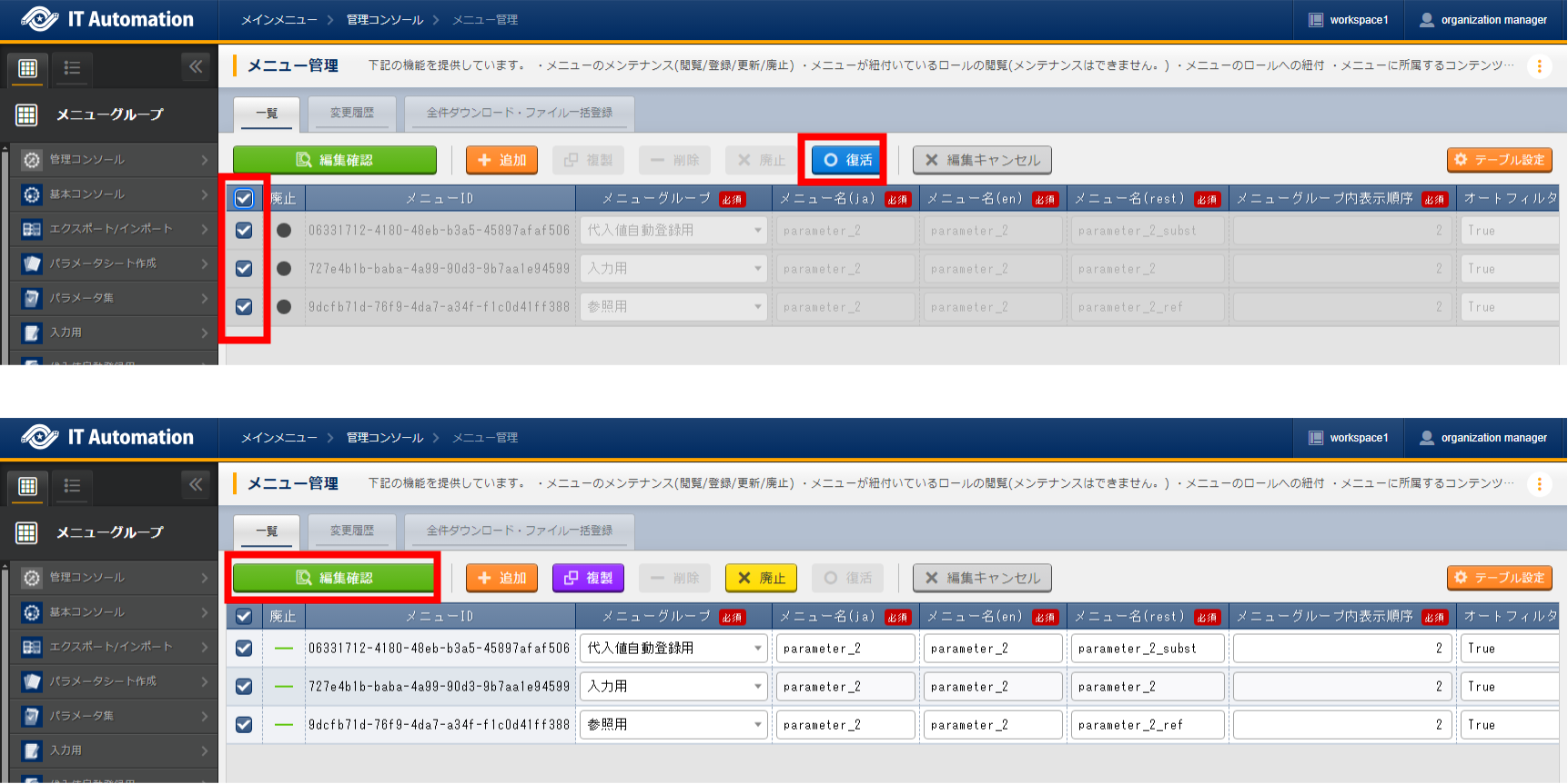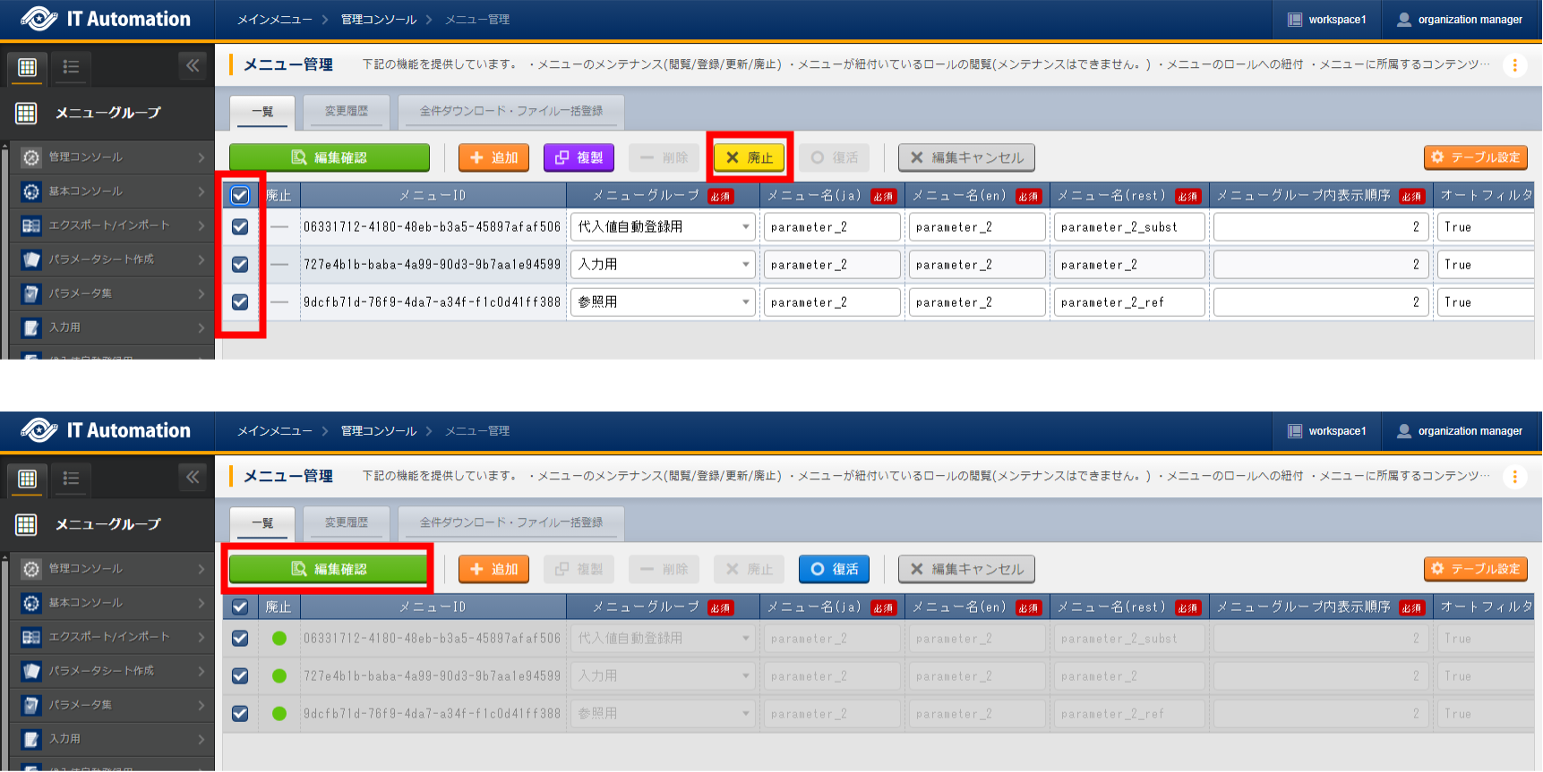 廃止・復活する対象は、パラメータシート作成時に指定したメニューグループに属するメニューを対象にしてください。