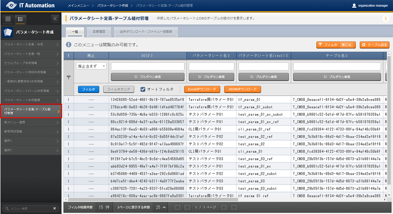 作成したパラメータシートとDBのテーブルの紐付けを表示します。