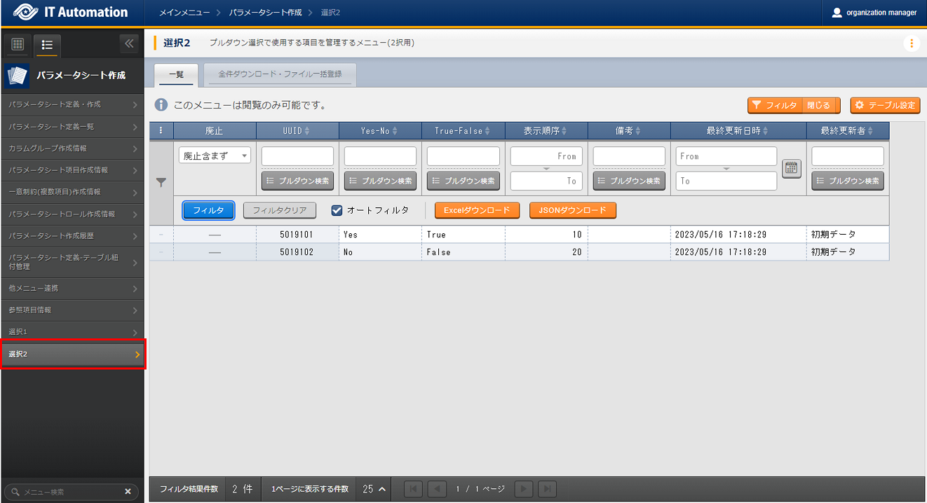 - 「データシート」を選択してパラメータシート作成を実行「代入値自動登録設定」メニューでは利用できないメニュー(データシート)が作成されます。