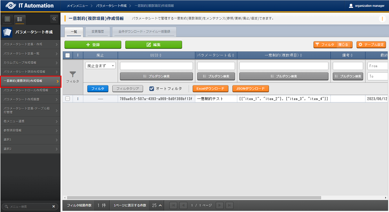 作成するパラメータシートまたはデータシートの一意制約(複数項目)をメンテナンス(参照/更新/廃止/復活)できます。
