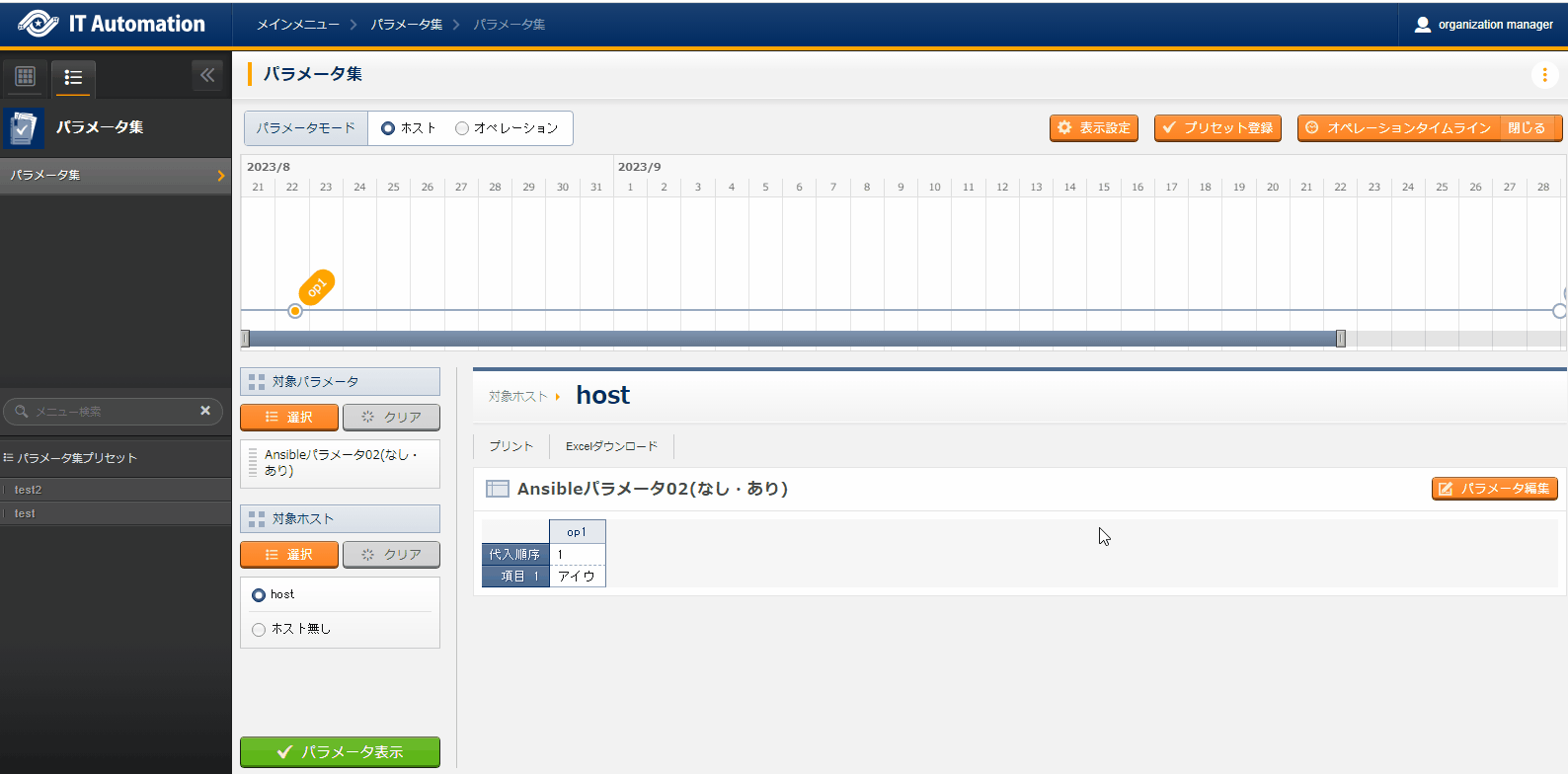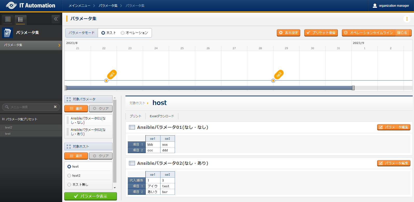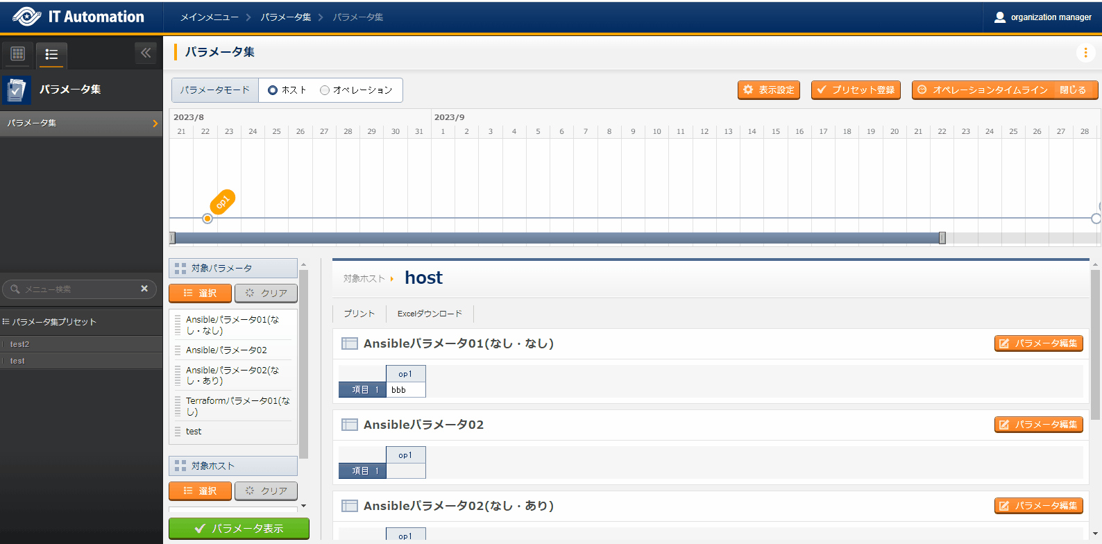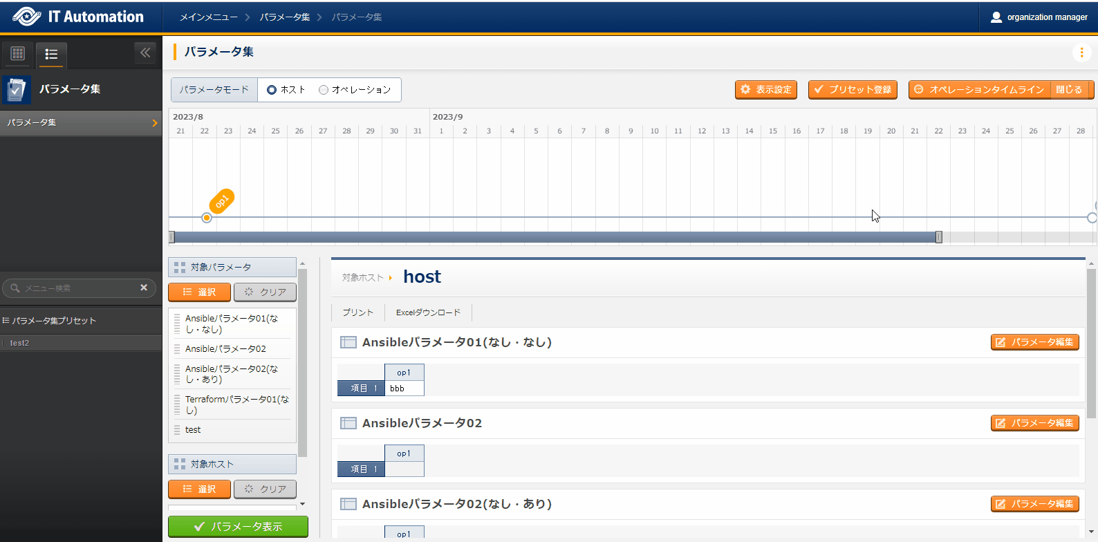 パラメータシートに紐付くオペレーションを1つ選択して、そのオペレーションを基にパラメータシートの複数のホストのデータを取得します。 |