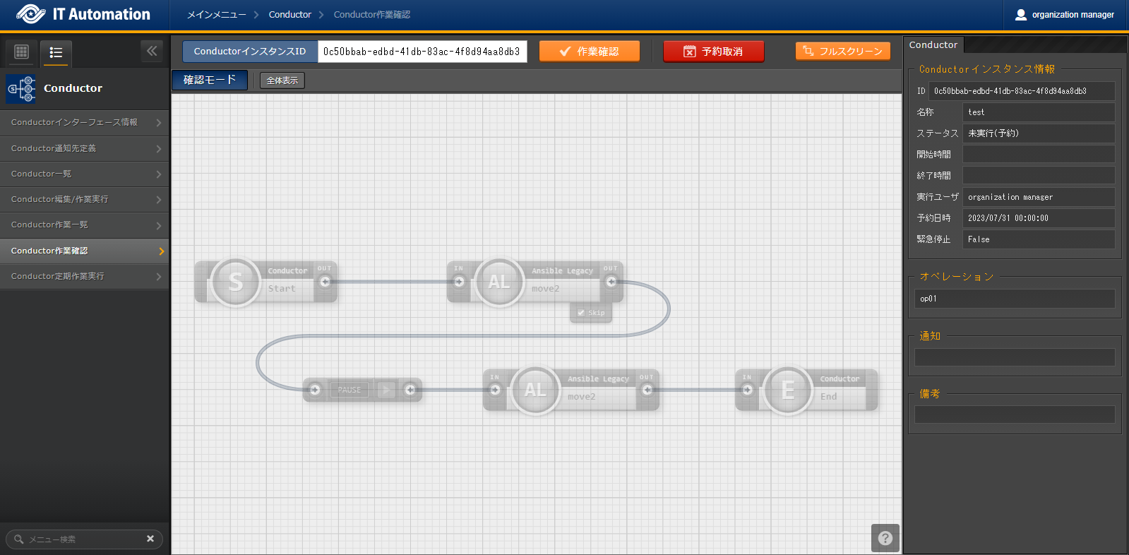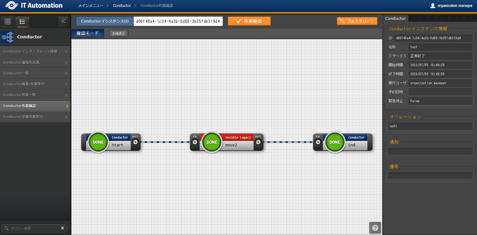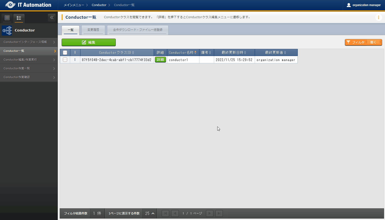 Conductor一覧(実行履歴)を閲覧出来ます。 詳細 をクリックするとConductor作業確認に遷移します。 |