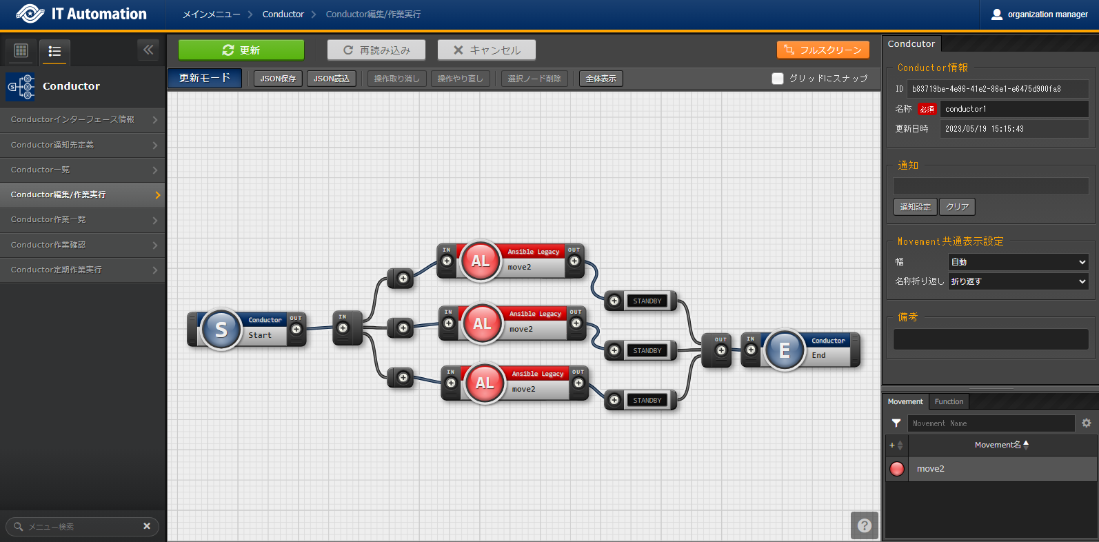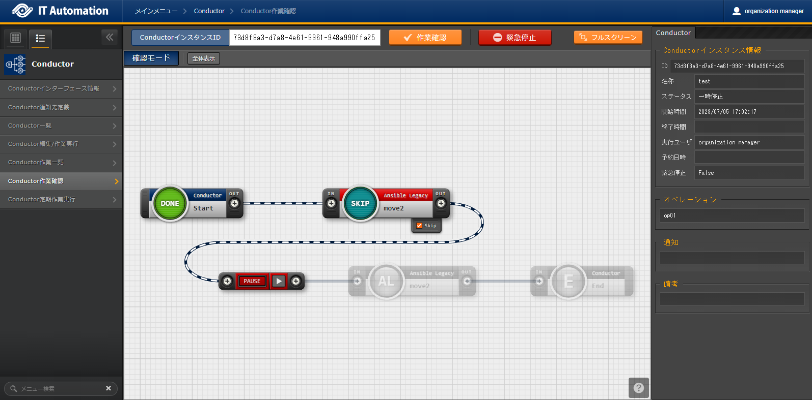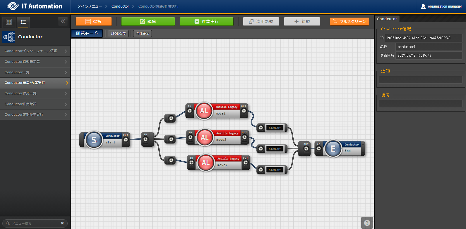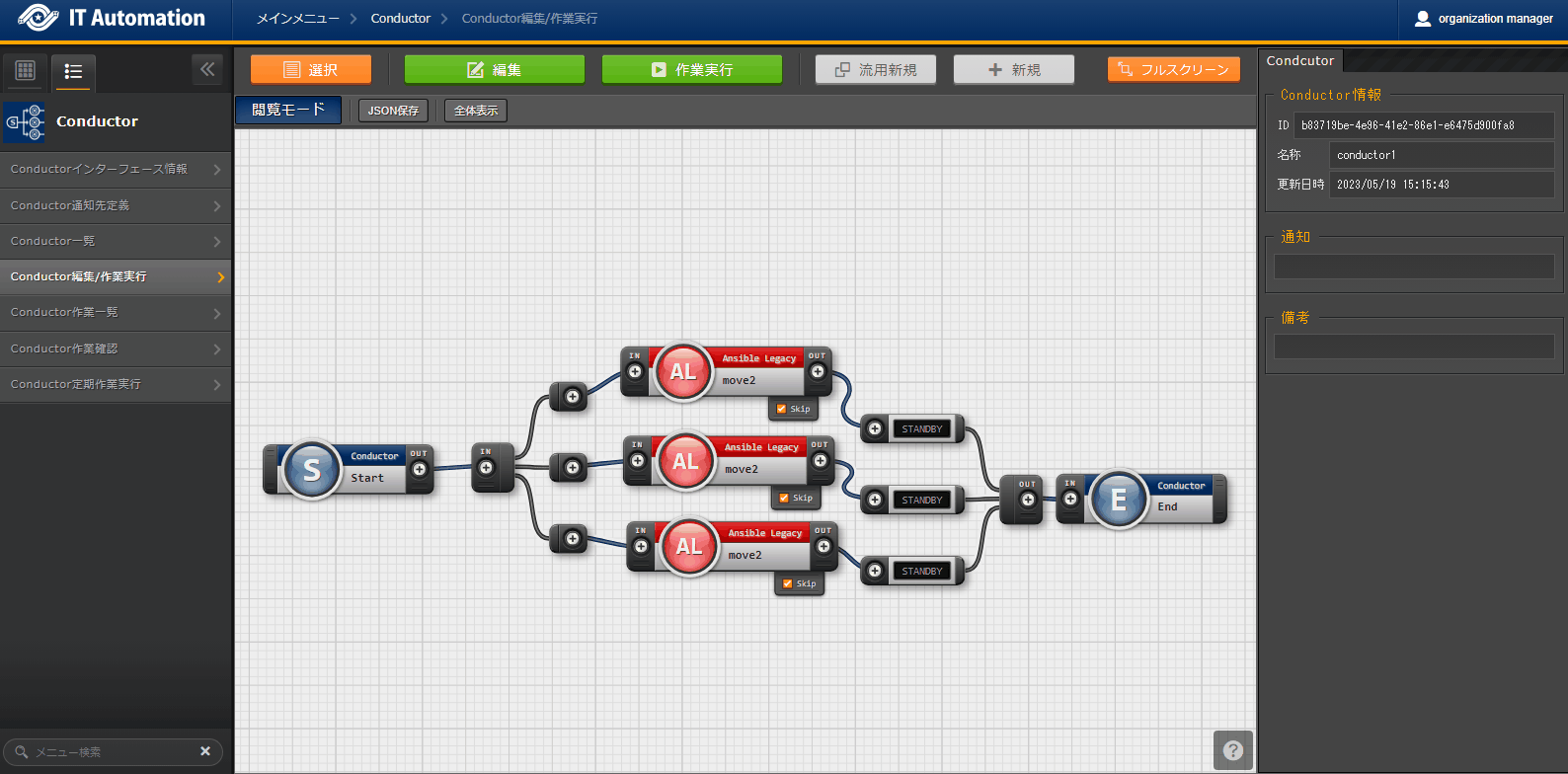 Conductor一覧(実行履歴)を閲覧出来ます。 詳細 をクリックするとConductor作業確認に遷移します。 |