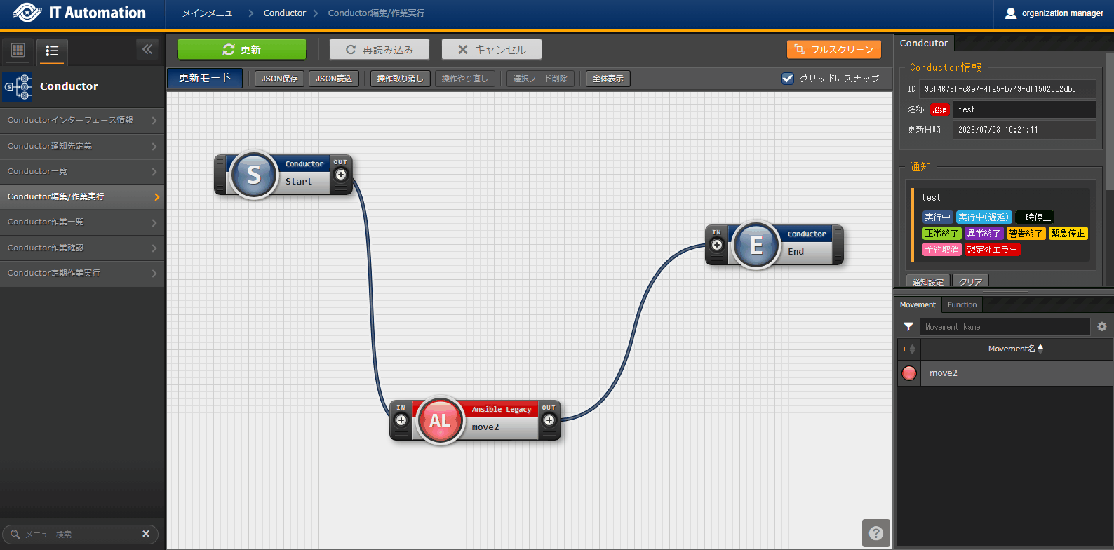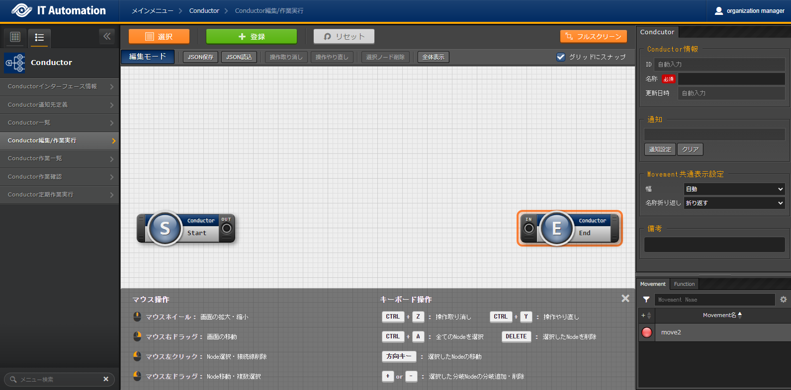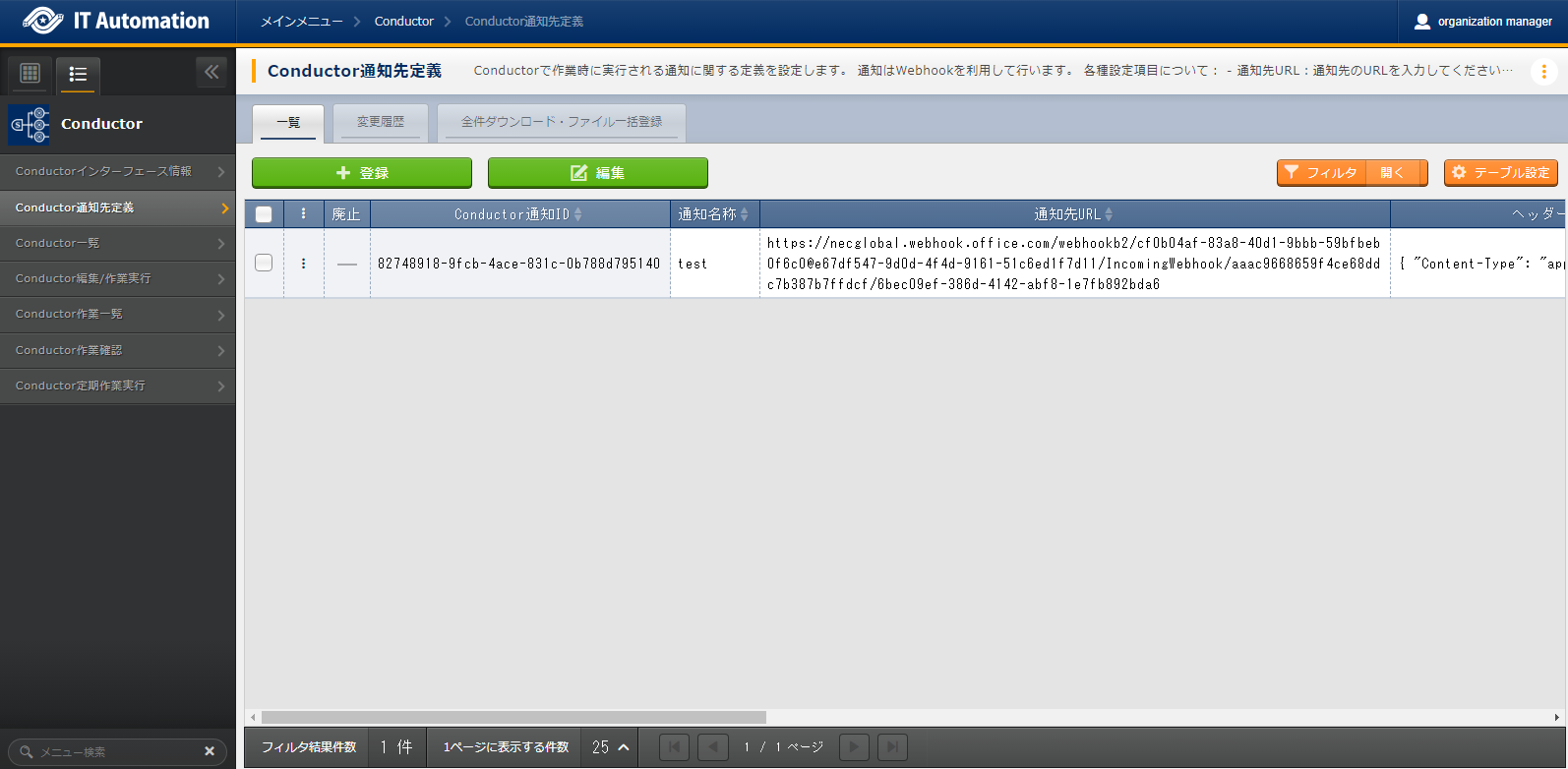 Conductor で作業時に実行される通知に関する定義をメンテナンス(閲覧/登録/更新)出来ます。 |