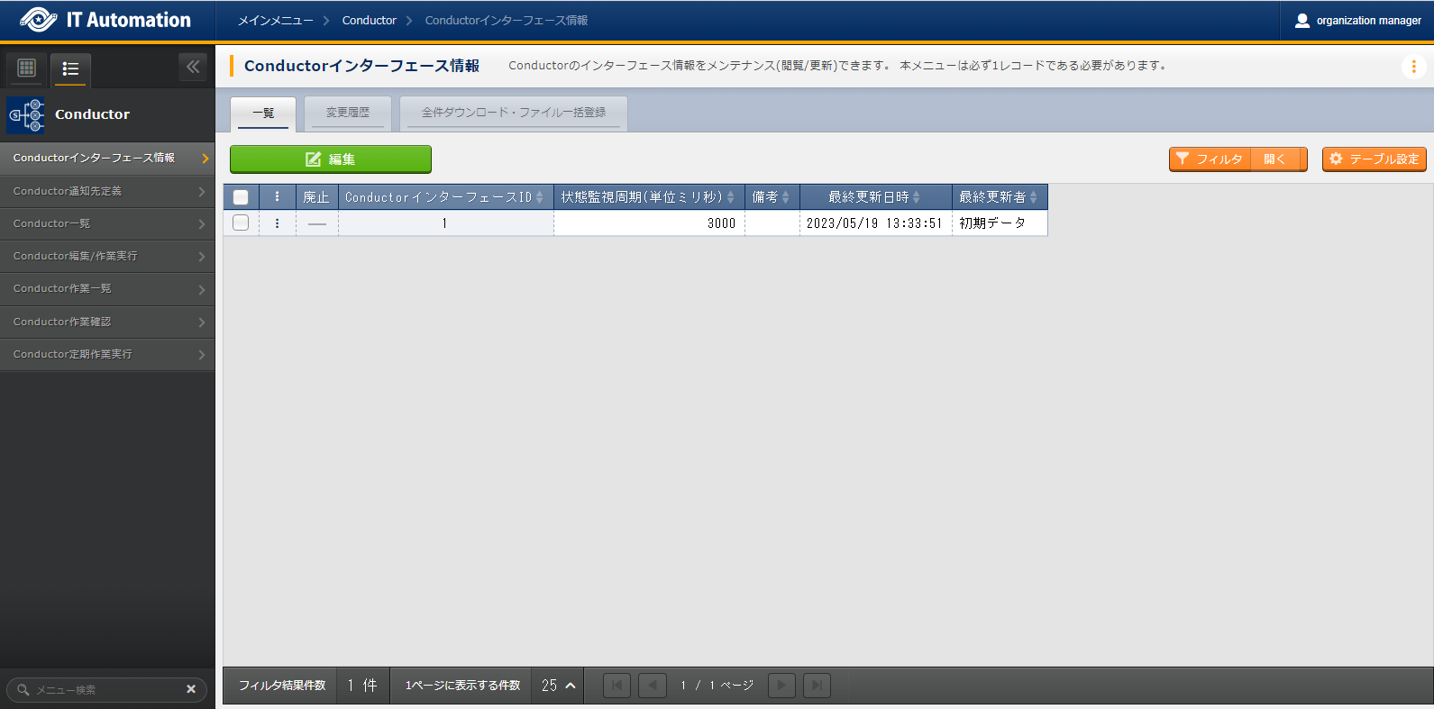 Conductorのインターフェース情報をメンテナンス(閲覧/更新)出来ます。 本メニューは必ず1レコードである必要があります。 |