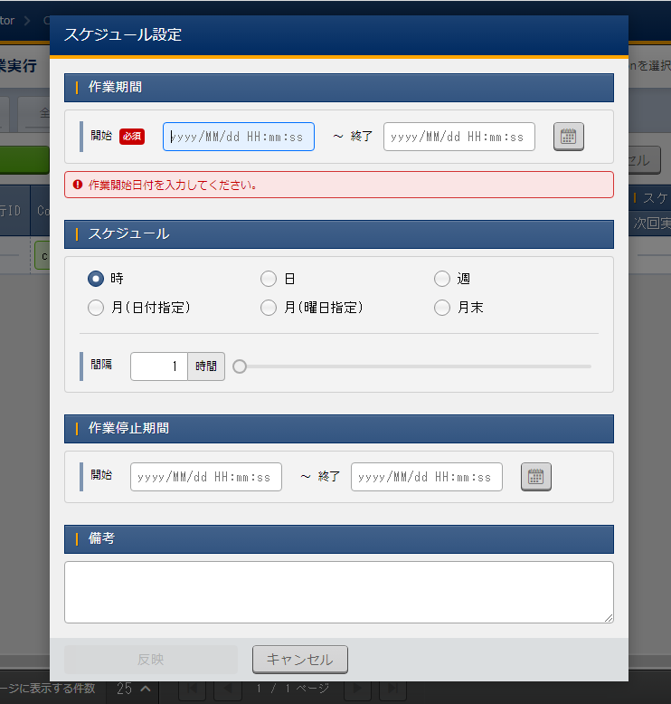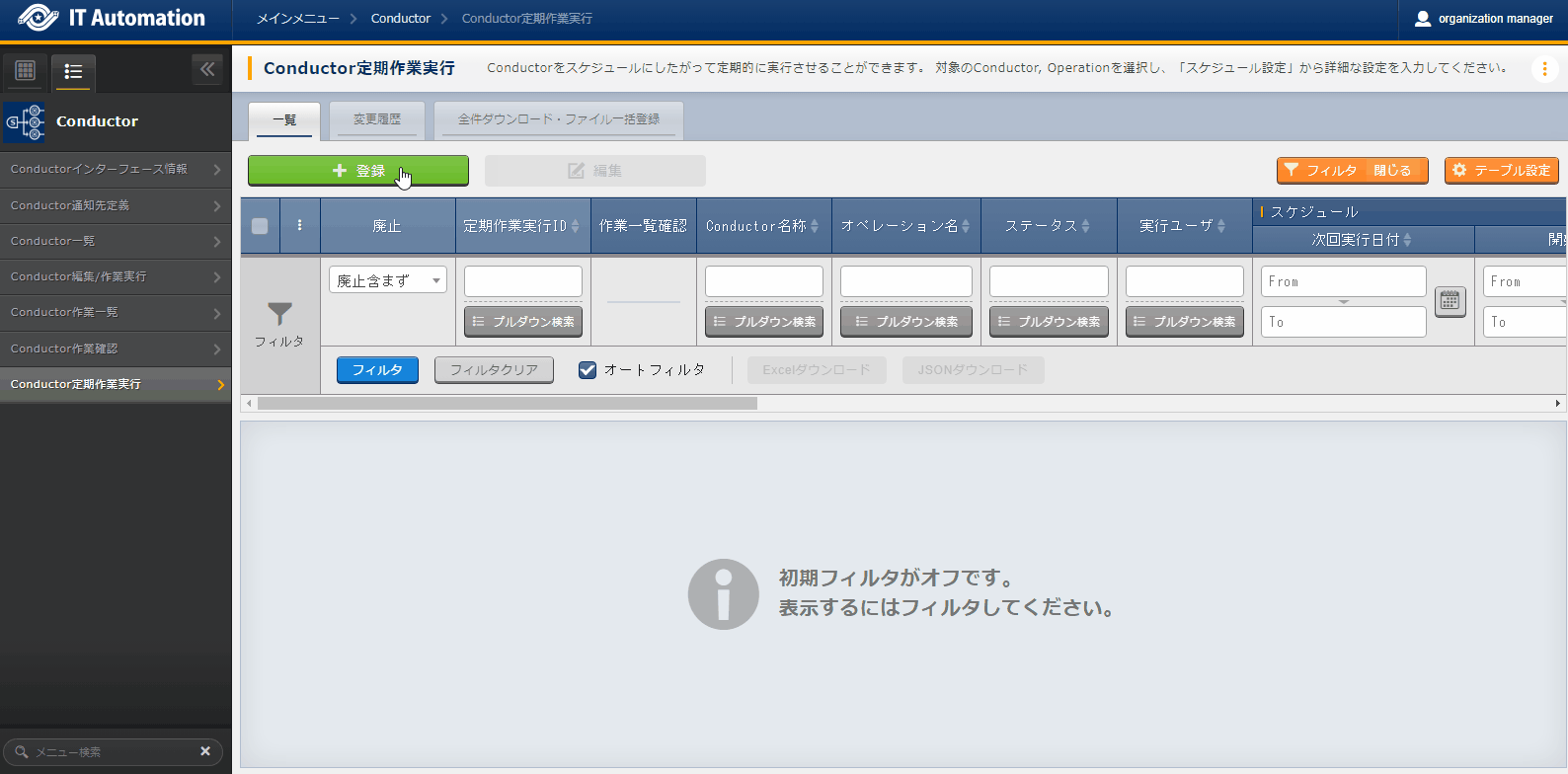 スケジュールに従って定期的に実行するConductor作業をメンテナンス(閲覧/登録/更新)出来ます。 作業履歴 をクリックするとConductor作業履歴に遷移します。 |