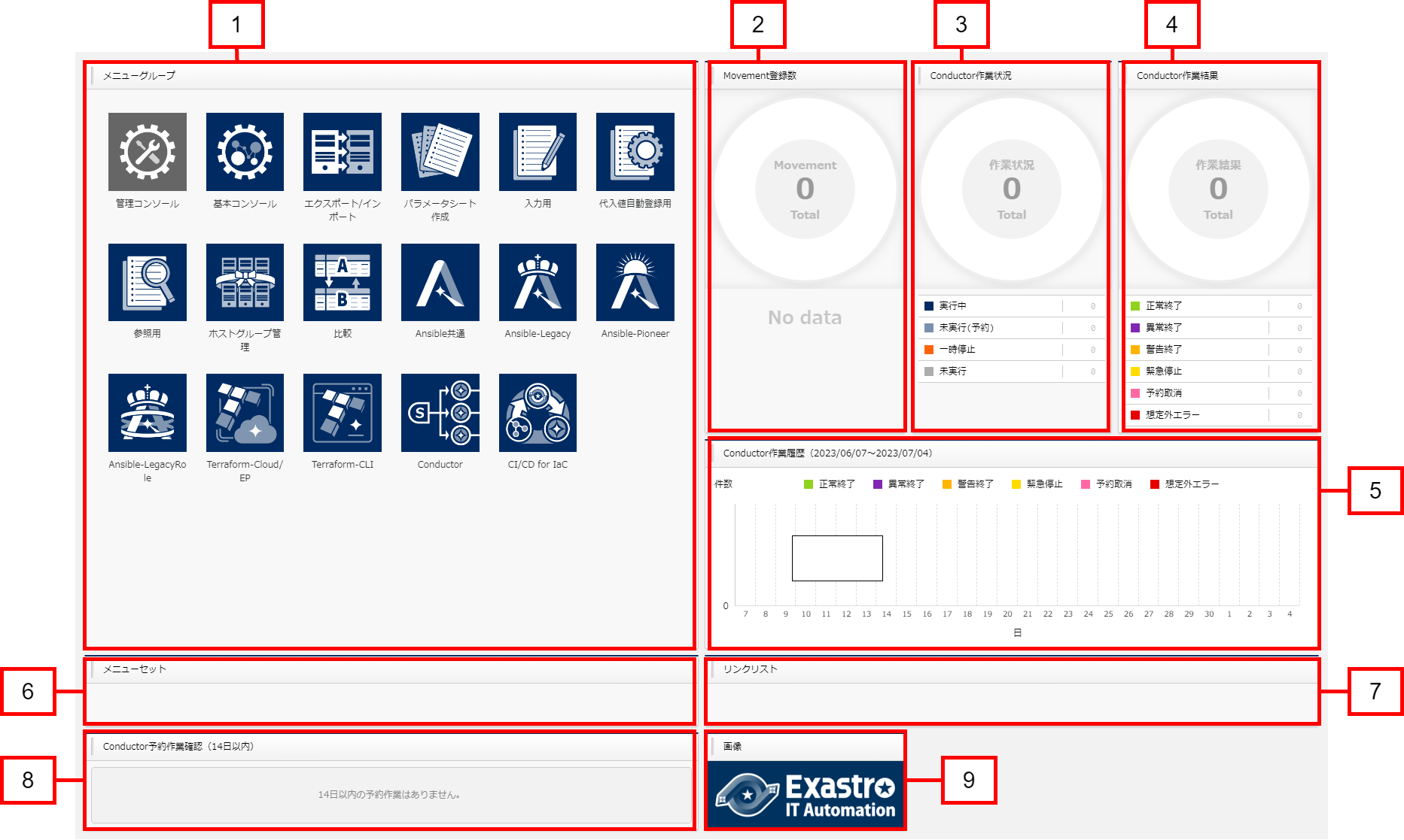 - 画面構成No.1~5のWidgetがデフォルトで表示されます。No.6~9はデフォルトでは表示されません。( Dashboard編集 → Widget追加 を押下することで追加できます)