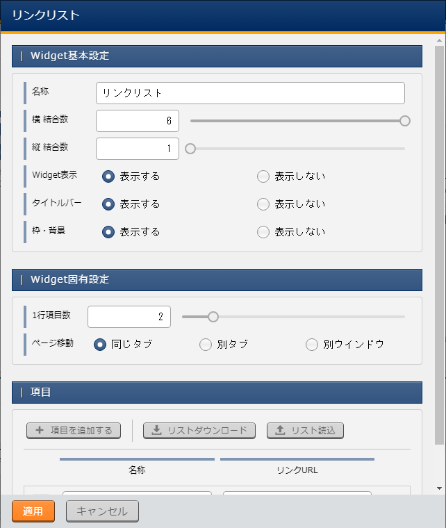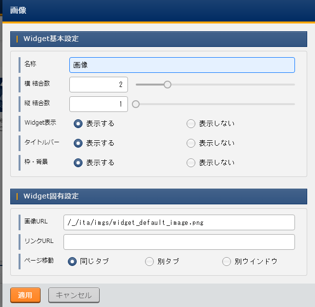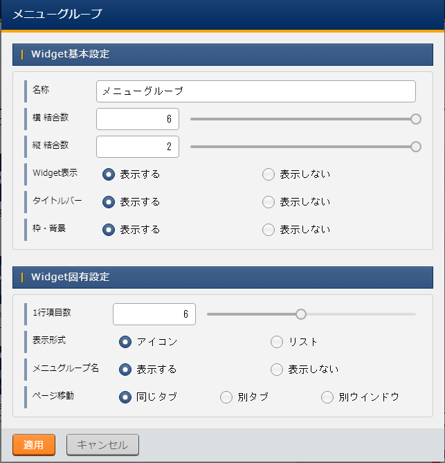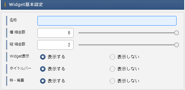 - :Widget編集が表示されます。各Widgetの編集項目は以下を参照してください。