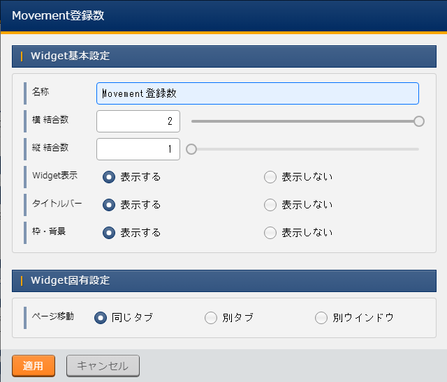 - Widget追加 で選択すると、Widget選択が表示されます。追加したいWidgetを選択し、適用 を押下すると、選択したWidgetが追加されます。