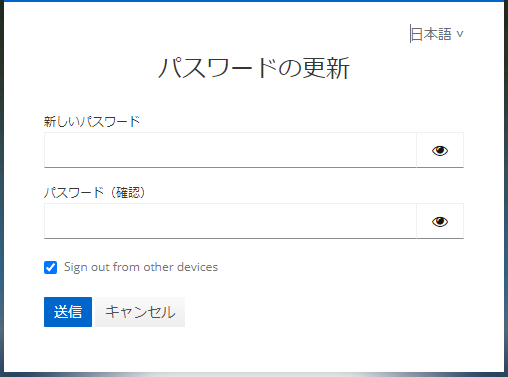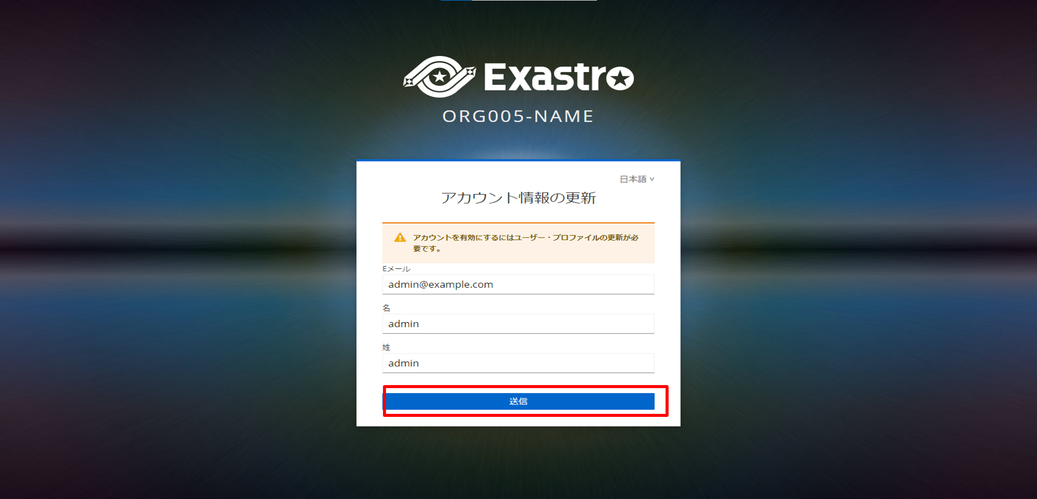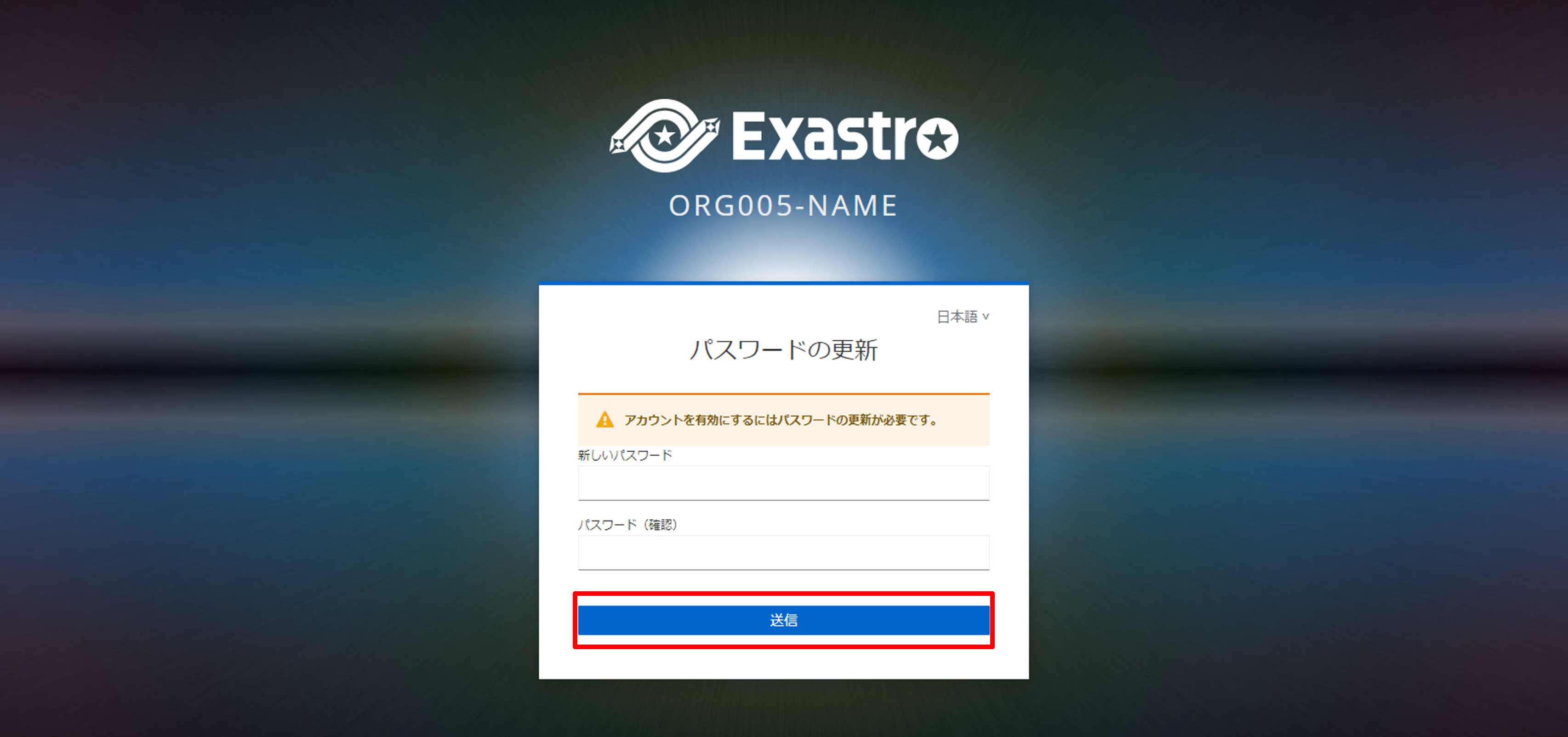 ※初回ログイン時は、オーガナイゼーション作成 で指定した管理者のログインID(ユーザー名、E-mailアドレス)、初期パスワードを使用してください。 - パスワードの更新を行い、送信 ボタンを押下します。